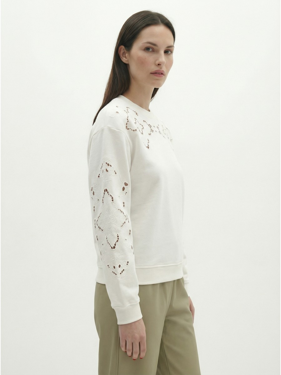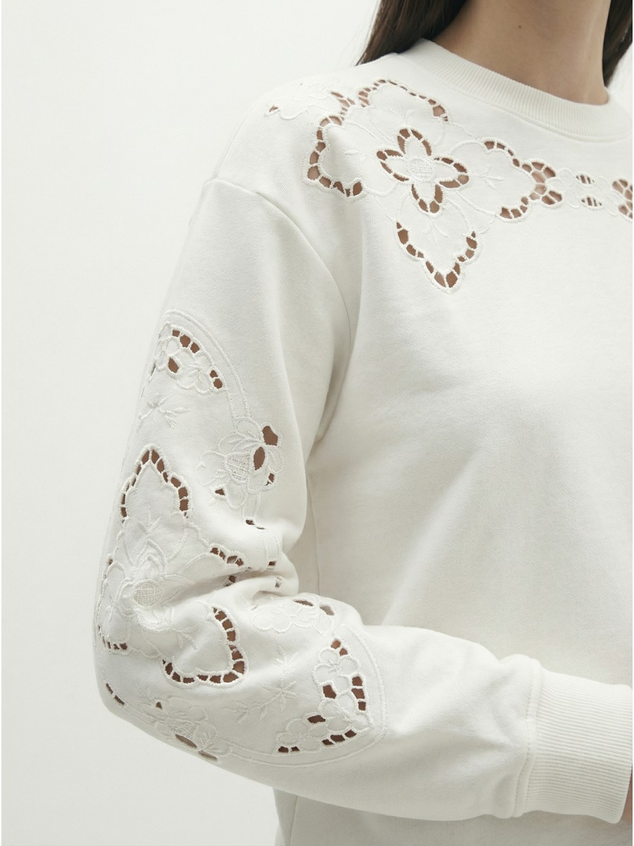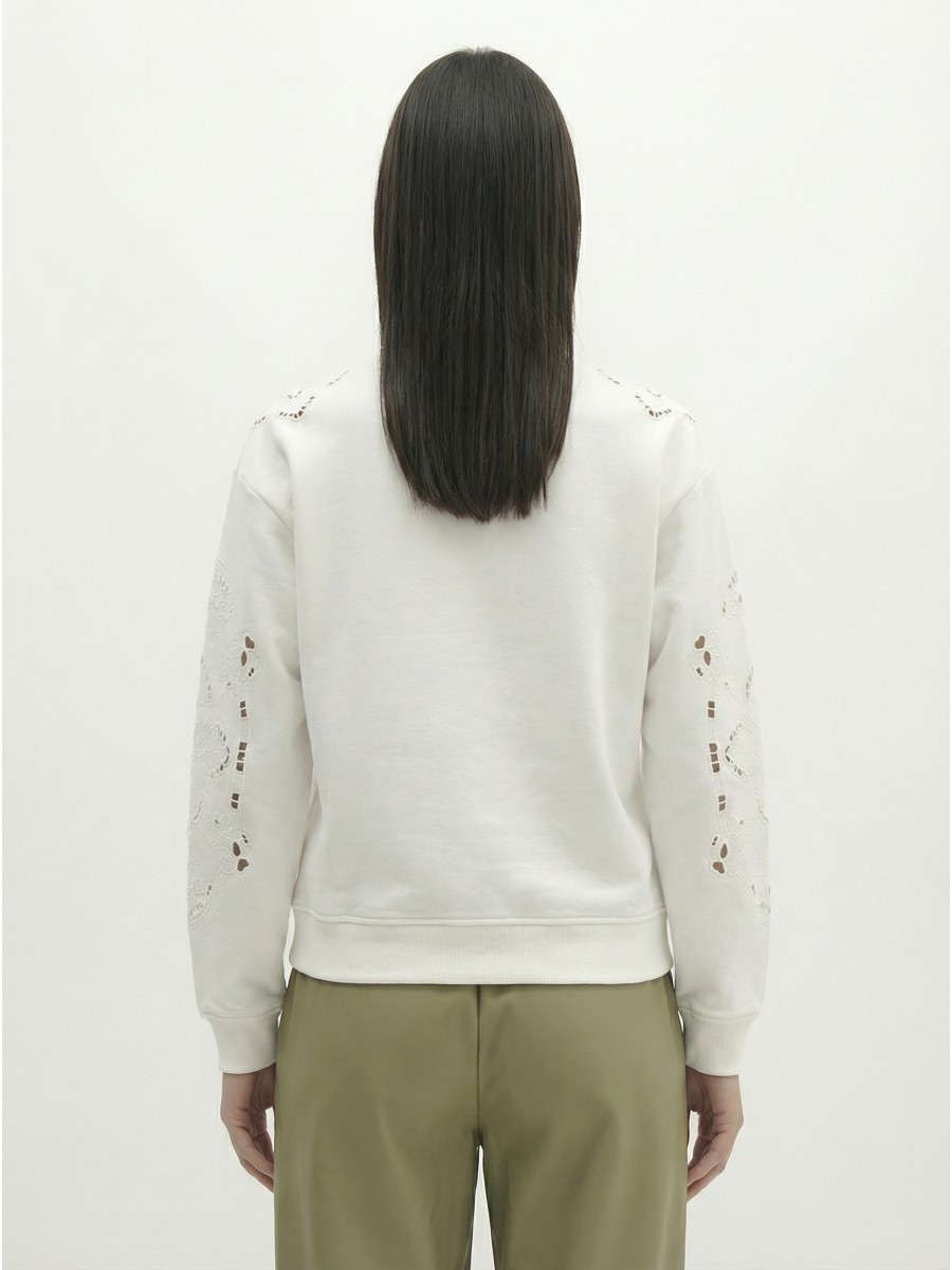 This loose round-neck sweatshirt combines comfort and femininity thanks to delicate flower embroidery on the sleeves and around the neckline. Perfect for a casual chic look, it pairs with straight-leg jeans or flowy trousers for a modern and trendy silhouette.