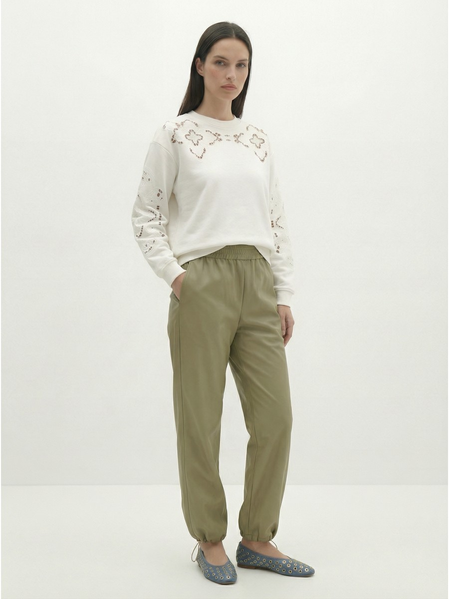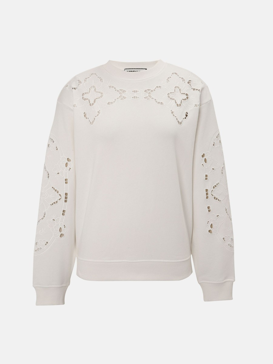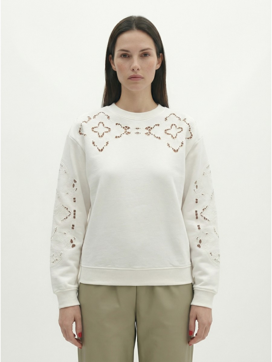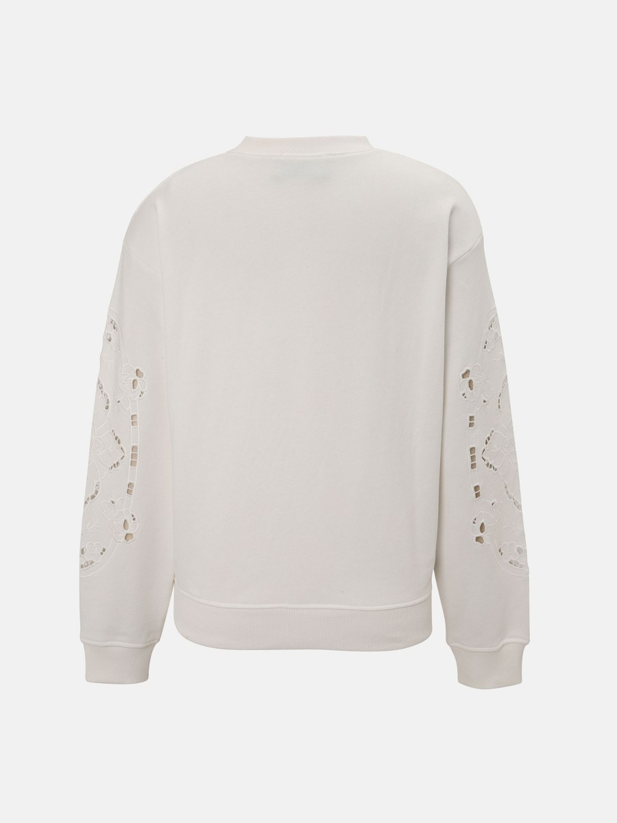 This loose round-neck sweatshirt combines comfort and femininity thanks to delicate flower embroidery on the sleeves and around the neckline. Perfect for a casual chic look, it pairs with straight-leg jeans or flowy trousers for a modern and trendy silhouette.