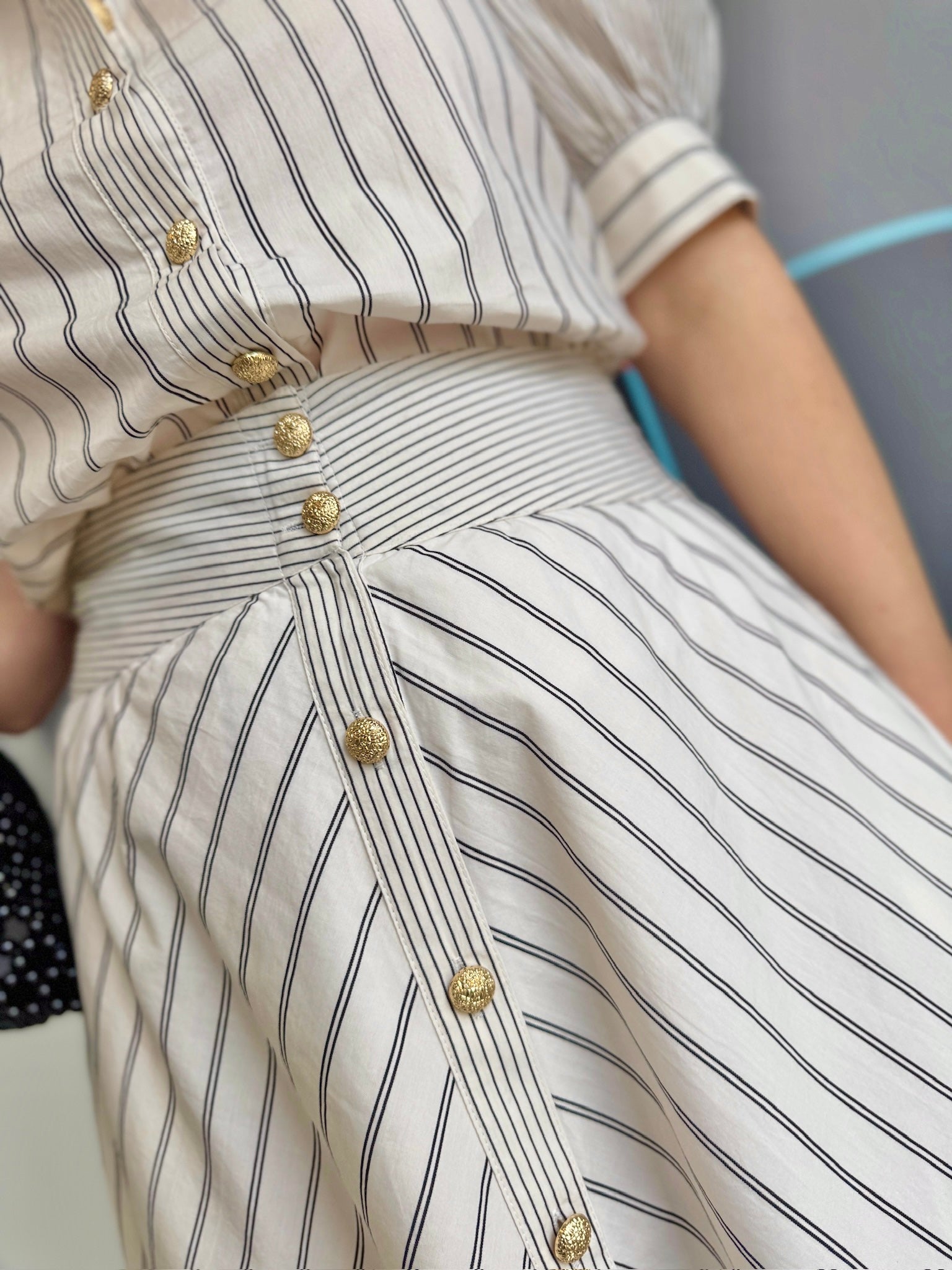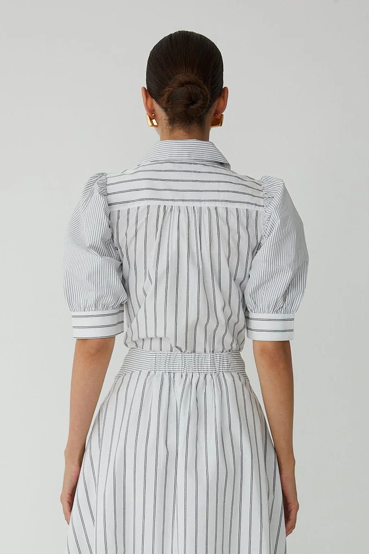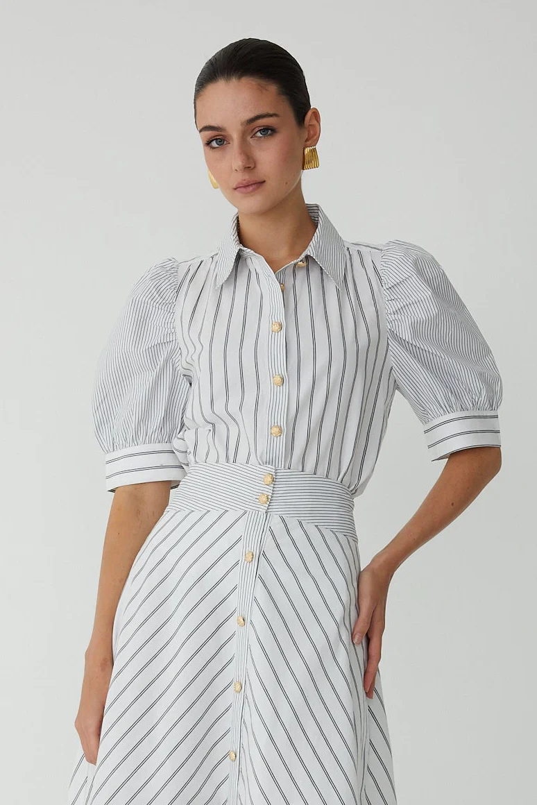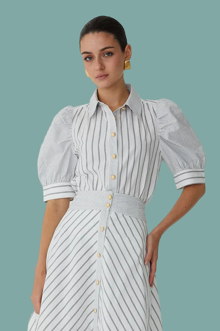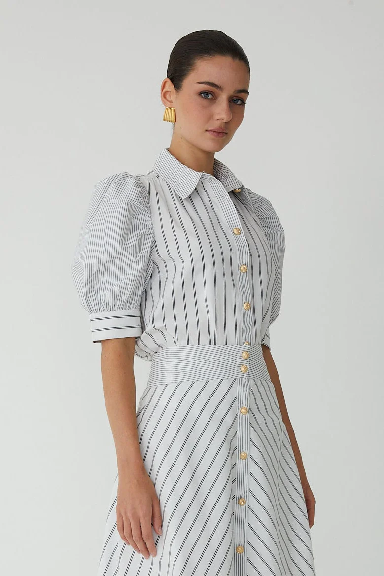 The Burke Blouse brings understated elegance to your everyday rotation. Crafted from crisp cotton poplin, this piece showcases a dynamic mixed stripe pattern elevated by gleaming gold buttons that catch the light beautifully. Puff sleeves add a playful touch of dimension, while the front button closure keeps things practical.