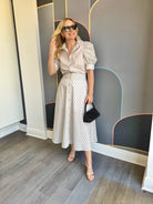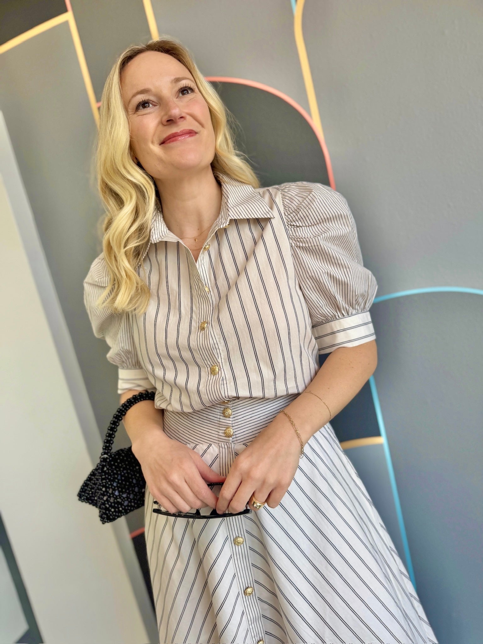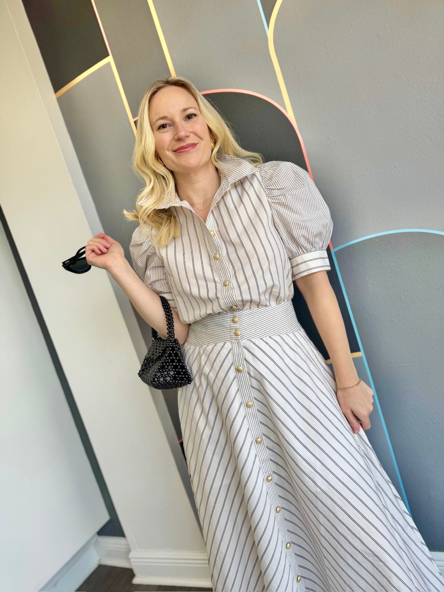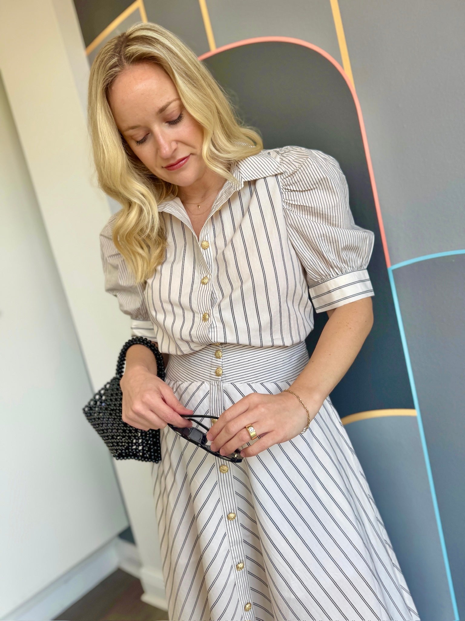 The Burke Blouse brings understated elegance to your everyday rotation. Crafted from crisp cotton poplin, this piece showcases a dynamic mixed stripe pattern elevated by gleaming gold buttons that catch the light beautifully. Puff sleeves add a playful touch of dimension, while the front button closure keeps things practical.