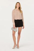 Crafted with a semi-sheer fabric covered in hot fixed rhinestones, this long sleeve button up top is perfect for layering under jackets, styling with denim for the office, or dressing up for date night.