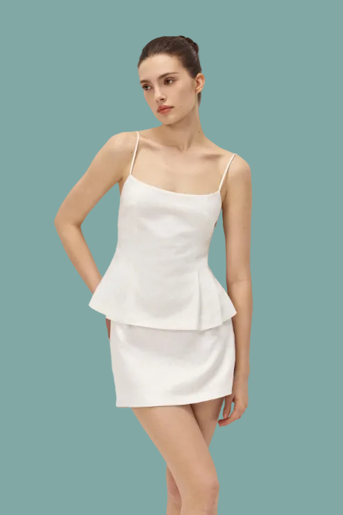 The Ellery Top combines effortless elegance with playful detail. This pleated peplum tank features a fitted bodice that flares at the waist for a flattering silhouette, while the smocked back adds texture and visual interest. Crafted in crisp white, it's versatile enough for casual styling with denim or dressed up for weekend occasions. Perfect for layering or wearing solo, this piece brings dimension and movement to any wardrobe.