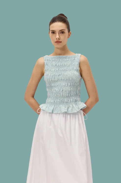 The Tegan Top is a charming smocked tank featuring a delicate seafoam gingham print that brings effortless summer style to your wardrobe. The fitted smocking at the bodice creates a flattering silhouette, while the playful ruffle hem adds movement and dimension. Perfect for warm weather dressing, this versatile piece pairs beautifully with shorts, skirts, or linen pants for an easy, put-together look.