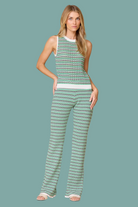 The Paula Pant features a flattering, elongating silhouette with a clean, streamlined fit through the hips and a subtly flared leg. Designed in a textured, multi-color wave pattern, it adds dimension while maintaining a polished look. Finished with a comfortable waistband, this versatile pant pairs perfectly with the matching Paula Tank or styled with simple tops for an elevated everyday outfit.