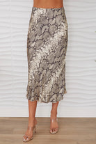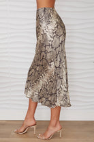 EXPERTLY CRAFTED FROM THE FINEST SILK, OUR PYTHON PRINT SILKY MIDI SKIRT IS A MUST-HAVE FOR ANY FASHION-FORWARD WARDROBE. WITH ITS EYE-CATCHING PYTHON PRINT AND SLEEK, MIDI LENGTH, THIS SKIRT ADDS A TOUCH OF SOPHISTICATION TO ANY OUTFIT. MADE WITH HIGH-QUALITY MATERIALS, IT'S BOTH COMFORTABLE AND STYLISH, MAKING IT PERFECT FOR ANY OCCASION. ELEVATE YOUR STYLE GAME WITH THIS UNIQUE AND VERSATILE PIECE.