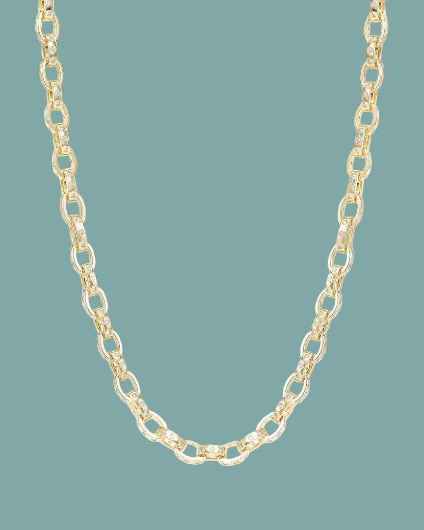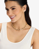 The Ashley Chain Link Necklace 9mm reimagines a classic silhouette with a bold, contemporary edge. Crafted in radiant 18k gold plated brass, each link is meticulously polished and accented with brilliant bezel-set simulated diamonds for a look that is both chunky and refined. This statement piece offers a little bit of everything, seamlessly linking luxury with an everyday aesthetic. Whether you are dressing for a formal event or adding a modern touch to a casual outfit, this versatile necklace delivers an unmistakable glow. It stands out beautifully on its own or can be layered with other trendy gold chains to create a personalized, edgy look. If you are searching for elegant handcrafted necklaces that define luxury jewelry, this 9mm chain is the ultimate choice for your rotation.