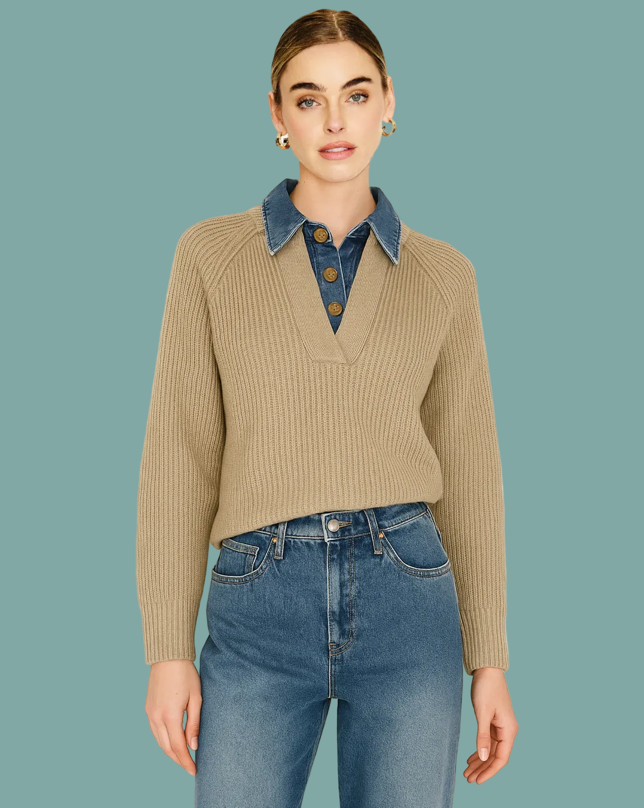 The Teena Sweater combines comfort with clever design—a ribbed knit base paired with an attached denim collar that gives you that layered look without extra layers. The V-neckline and button placket add polish, while the lightweight construction keeps things cozy without the bulk. Perfect for throwing on over your favorite tee or wearing solo, it transitions seamlessly from casual weekends to polished weekday looks. Whether you're pairing it with jeans or trousers, this sweater is your go-to piece for effortless fall and winter style.