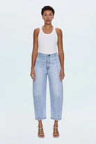 Introducing your new denim obsession: Blair High Rise Seamed Barrel jeans. The modern shape and lack of waistband create a sleek silhouette, while chic seaming adds a touch of sophistication. With a flattering ankle length and easy light wash, these jeans are both versatile and stylish.