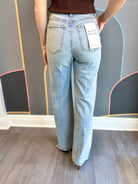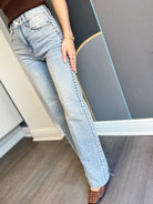 Step into the spotlight with these light wash wide leg jeans featuring a playful raw hem and sparkling studs lining both outside seams. The high-rise fit flatters your silhouette while adding a fun, retro vibe to your look. Perfect for dancing through the day or night, these jeans bring effortless style and a touch of sparkle to every move.
