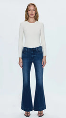 Mid rise waist with a sophisticated ultra-flared leg opening for unquestionably slimming proportions. Crafted from Pistola's signature comfort stretch denim. Modern is a deep blue dark denim wash with tonal stitching and gunmetal hardware.