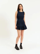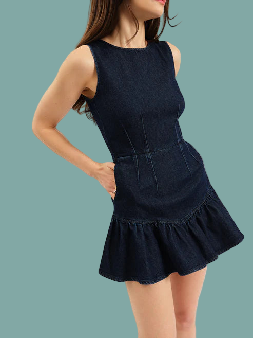 The Laurel dress in Moonlight is a denim ruffle dress in a romantic dark wash. Clean lines flare into feminine ruffles to created an elevated silhouette that can easily be dressed up or down.