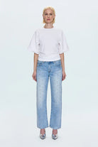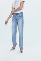 The best-selling jean that understands proportions. Lexi sits at the perfect mid-rise with our signature bowed straight leg, and a subtle curve at the knee that creates dimension without effort. Finished with a 29" inseam, the silhouette tapers to a cropped ankle with a clean hem. Crafted from our rigid denim in Aries, a light blue wash adorned with subtle stud details that feel refined and intentional, never overdone. Your must-have statement jean for making an impact with sophisticated appeal.