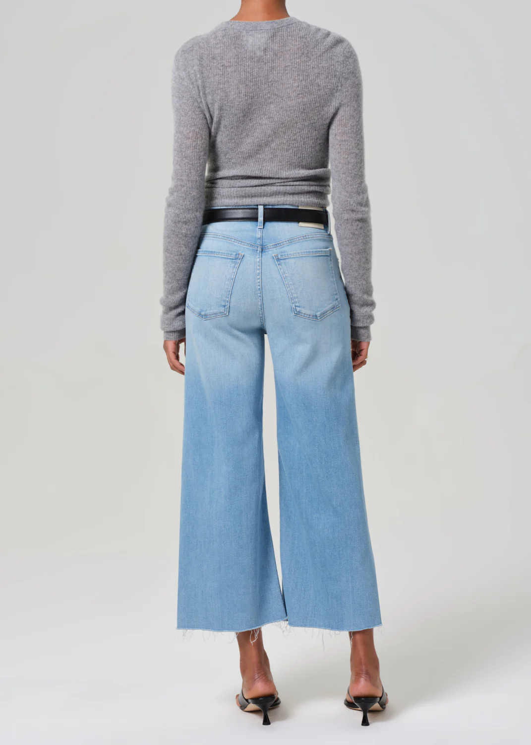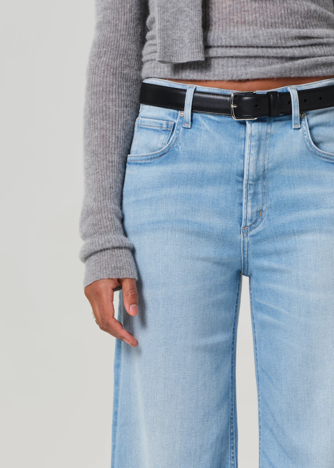 Upgrade your denim game with the Lyra Wide Leg Crop Jean in Belmont wash. Vintage inspired, this high-waisted silhouette offers a relaxed fit with a cropped length and voluminous wide leg. True to size. Looks like light indigo with fading and whiskering.