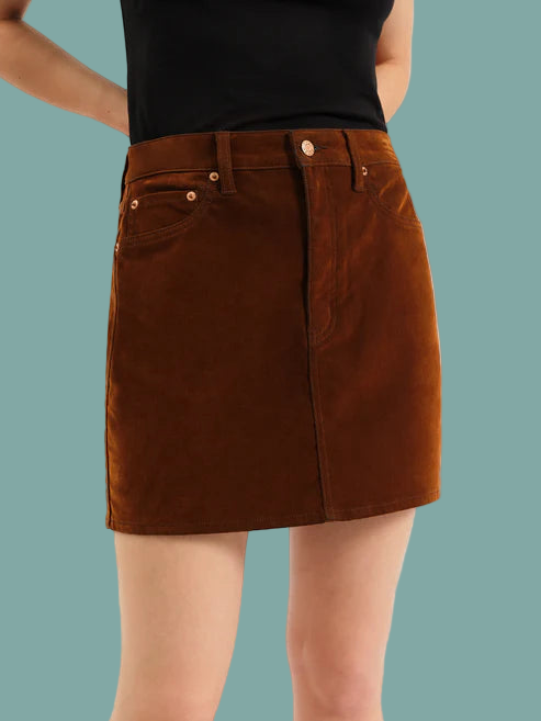 The Stash Skirt in Cognac is a flirty high rise mini skirt in a soft, flocked denim. This skirt's velveteen finish gives it a refined look while maintaining a soft feel.