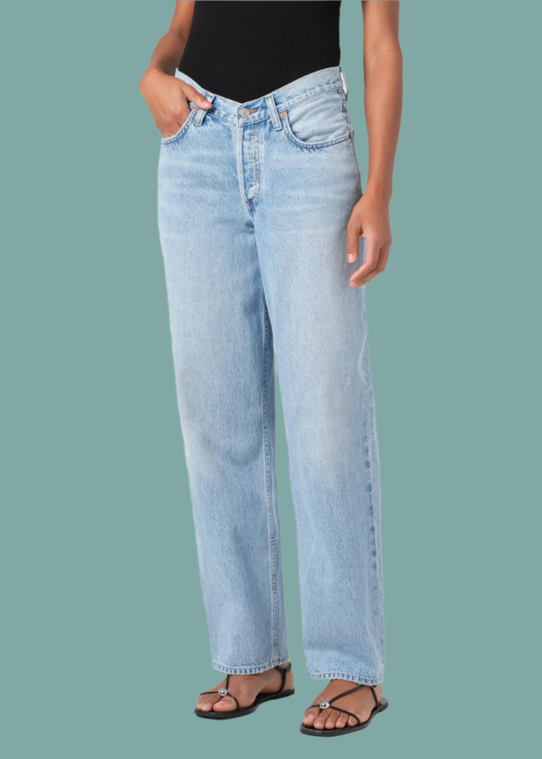 Introducing the newest jeans - the V-Waist Baggy Jeans! With its flattering v-front waistband and relaxed, straight leg silhouette, this style is both effortless and chic. Made from regenerative cotton, this light marbled indigo pair offers subtle fading and finished hems, adding a touch of effortless cool to your wardrobe.