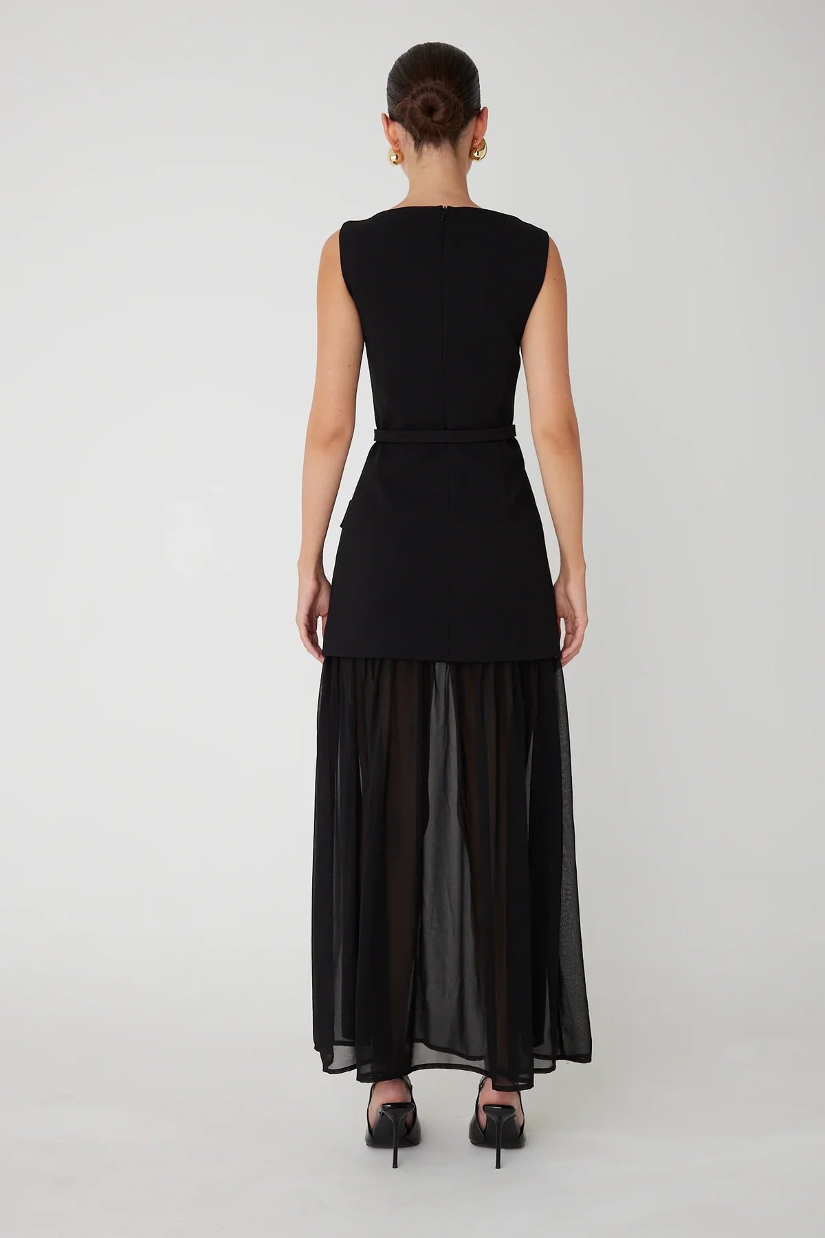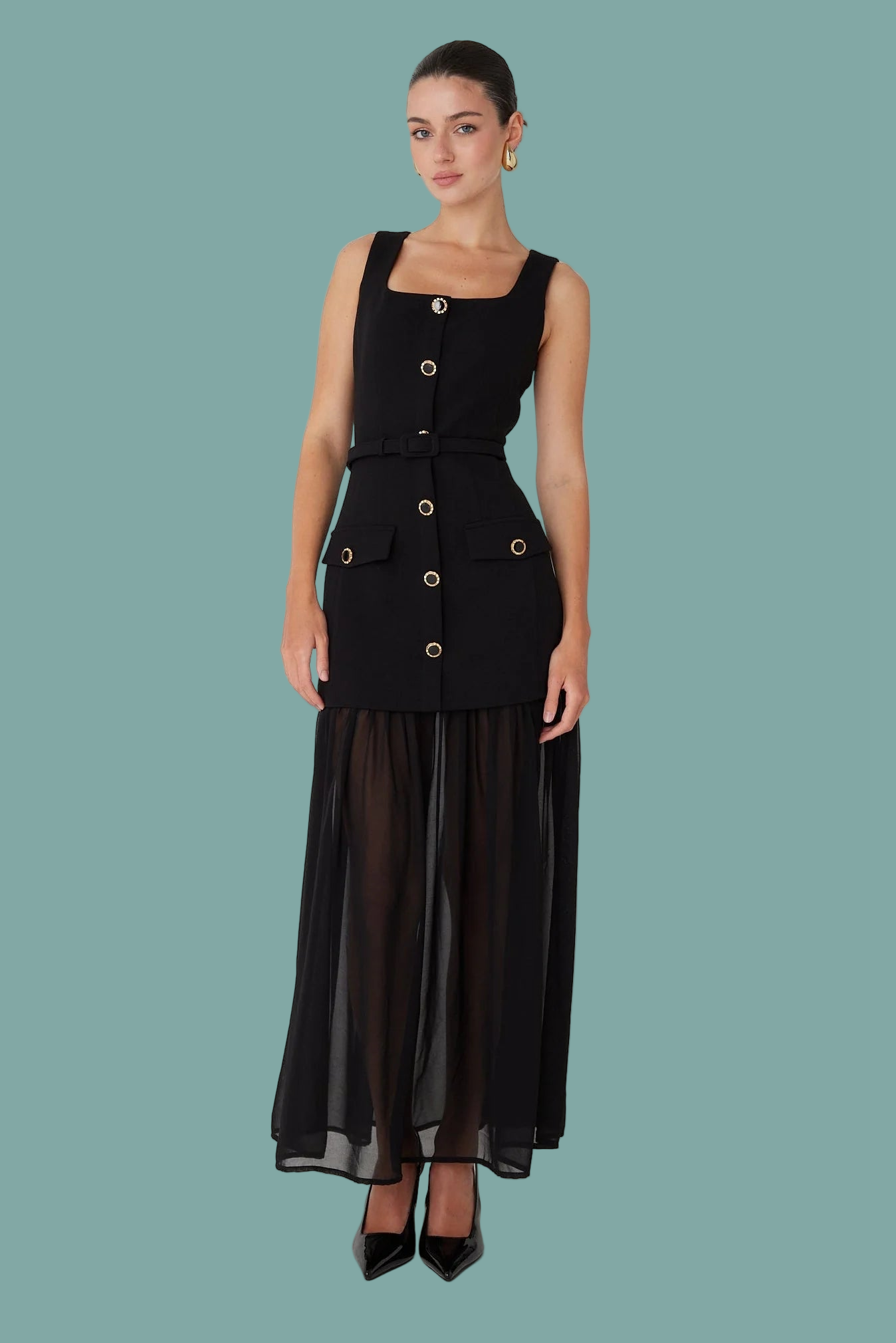 The Annette Dress brings timeless elegance to your formal wardrobe. This sophisticated black crepe design features a fitted, tailored bodice with a sheer chiffon skirt that floats beautifully. A coordinating fabric-covered belt cinches the waist, while gold and black button details add a polished touch. The fully lined bodice ensures comfort, and a back invisible zipper provides a seamless finish. At approximately 55" from shoulder to hem, it's the perfect length for black tie events and upscale cocktail occasions. Made from 100% polyester and dry clean only.