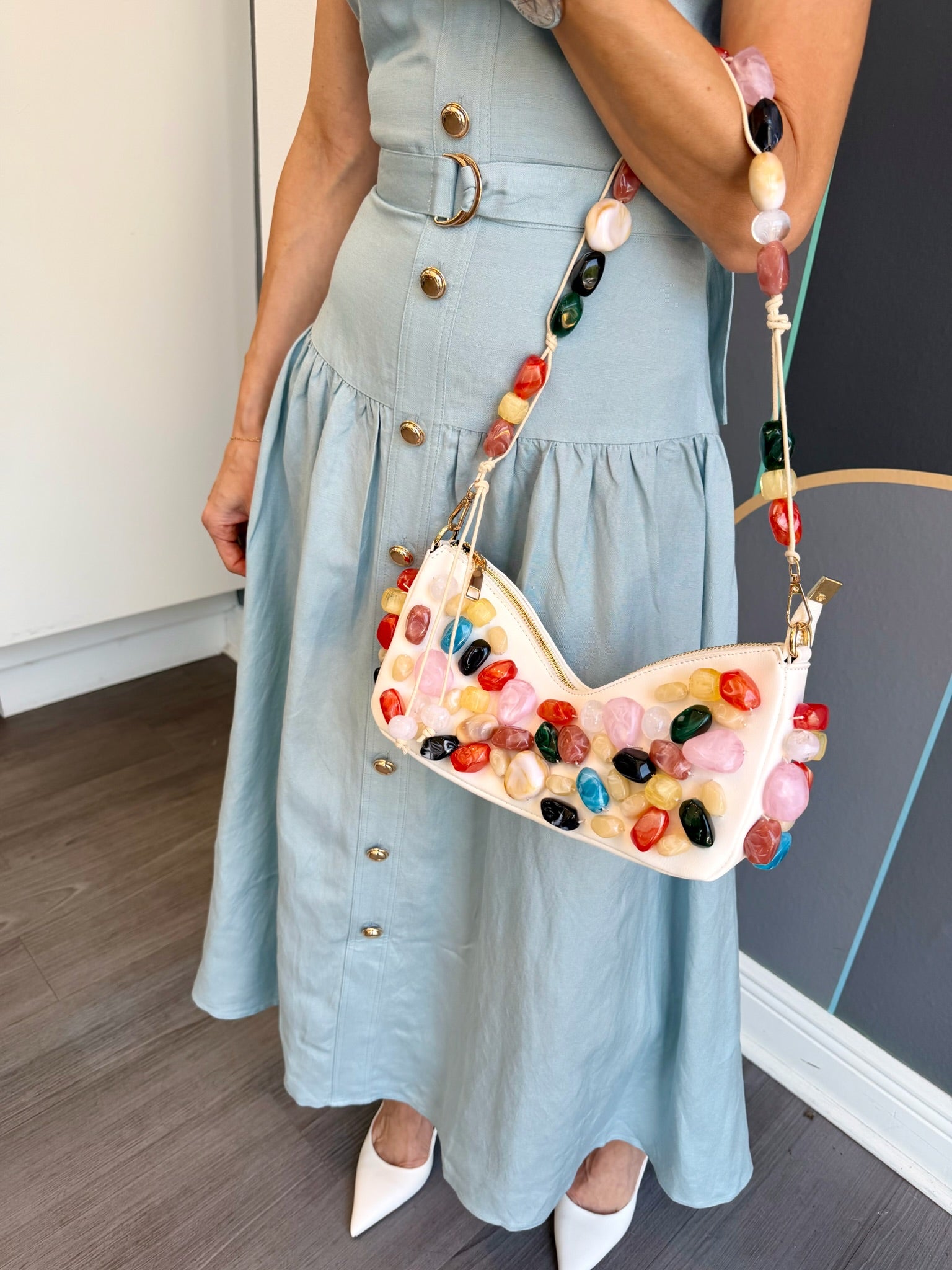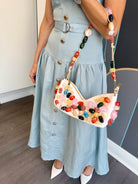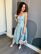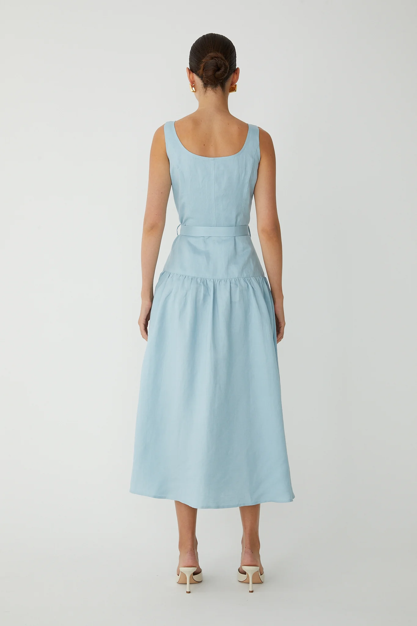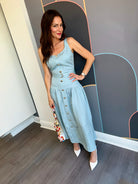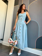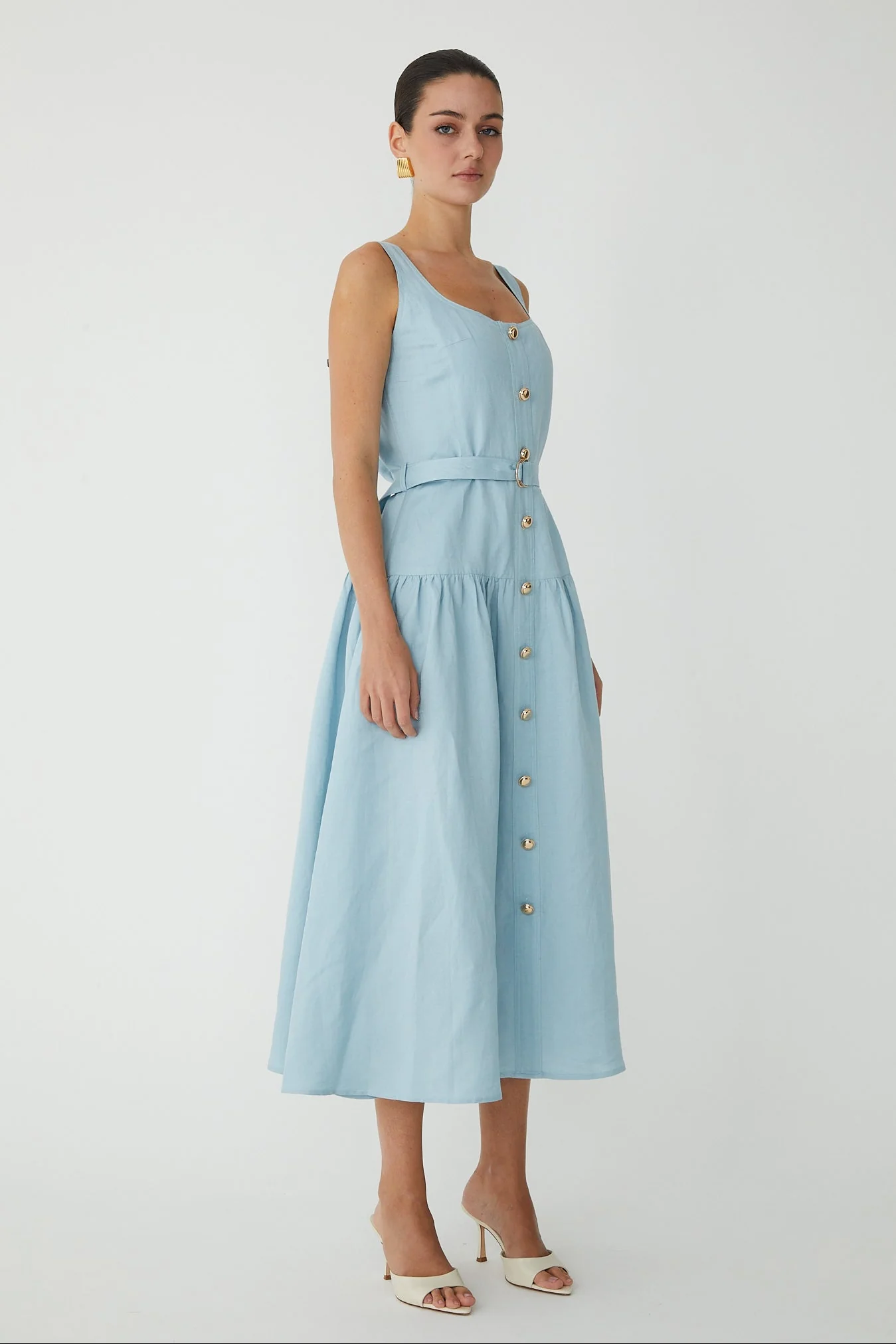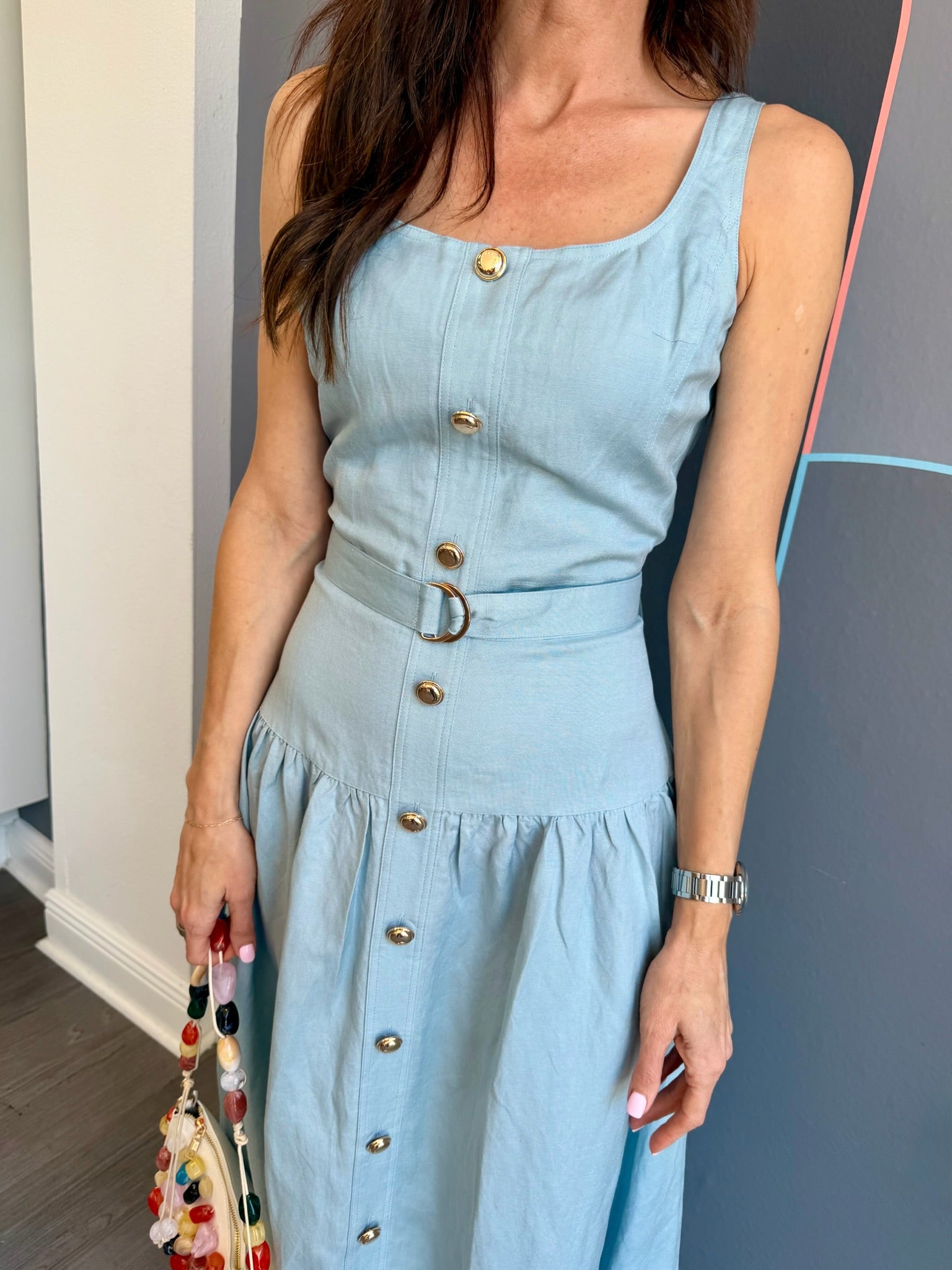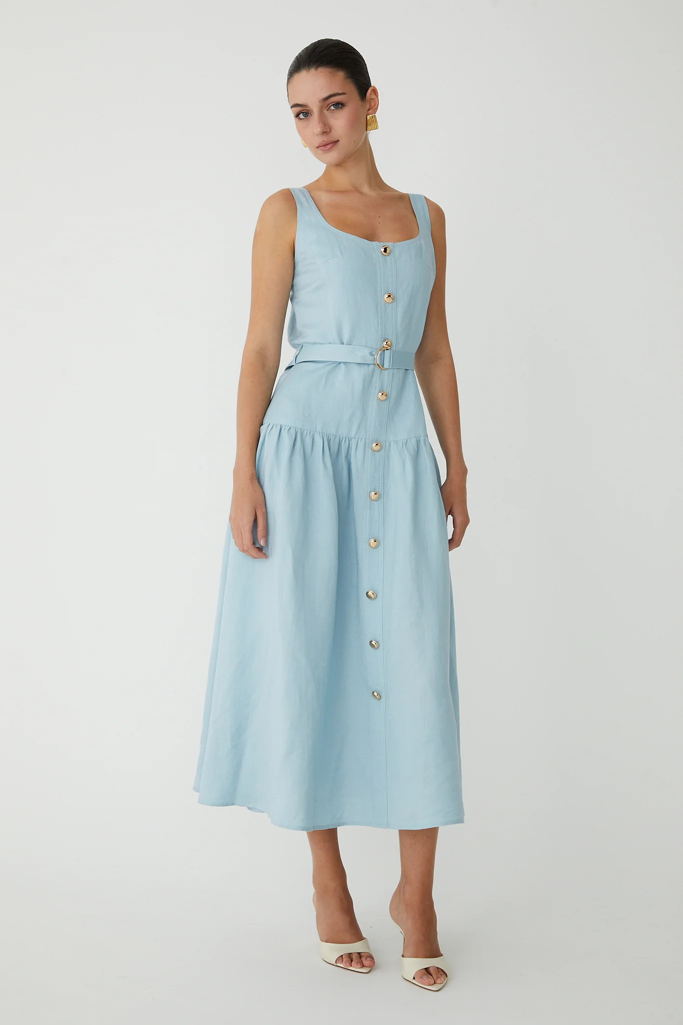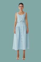 Effortless elegance meets timeless style with the Callan Sleeveless Belted Dress from JS71. This midi-length silhouette features a flattering drop waist design with a faux button front adorned with gold tone accents. The removeable self-belt with matching gold buckle and belt loops offers versatile styling options, while the concealed side zipper ensures a seamless fit. A lined bodice provides structure and comfort. Crafted from a breathable linen and viscose blend, this sky-blue dress transitions beautifully from day to evening. Dry clean only.
