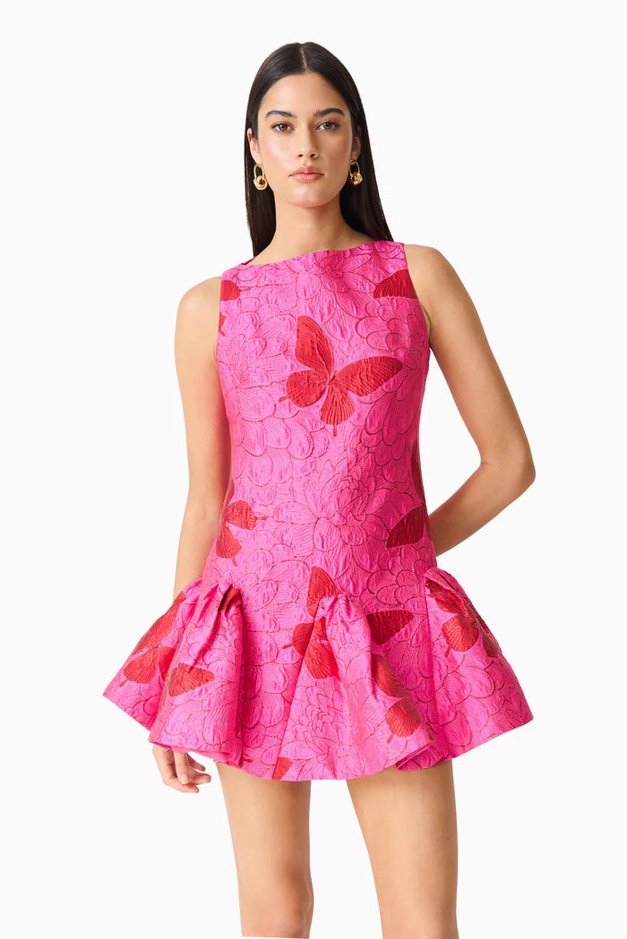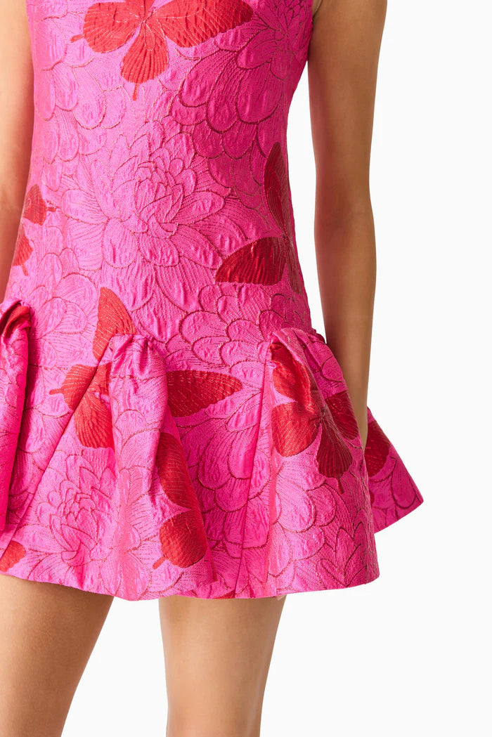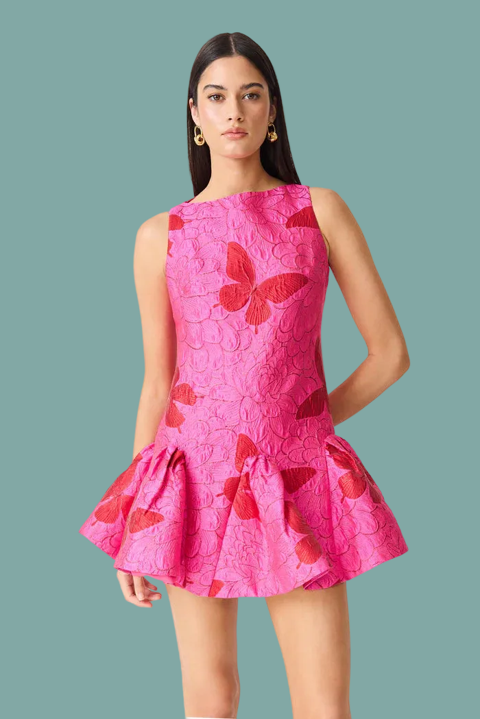 Make a statement at any event with the Lorena Jacquard Mini Dress in Pink. Crafted from luxurious jacquard fabrication, this dress features a delicate pattern of dark pink butterflies that add a playful yet elegant touch. Its high neckline gives a sophisticated silhouette, while the fully lined design ensures comfort and an impeccable fit. Perfect for cocktail parties, garden weddings, or special occasions, this dress maintains a regular fit that flatters every figure.