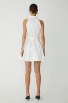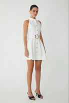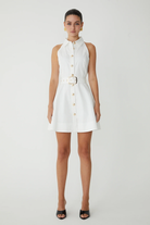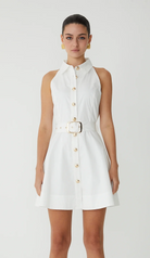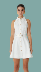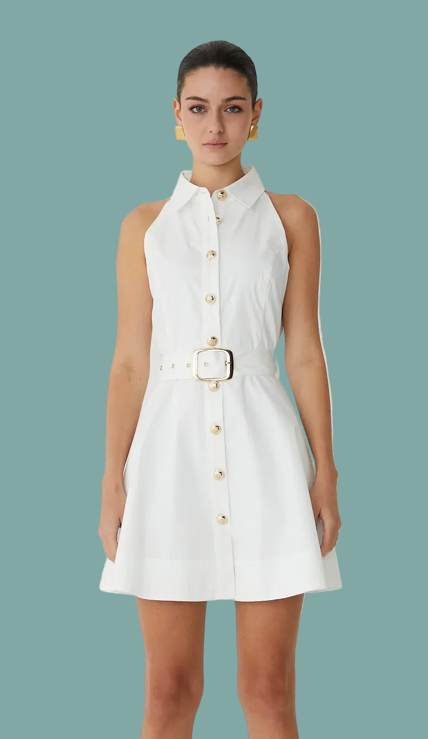The Meredith Dress is a wardrobe essential that works for any occasion. Made from crisp white cotton poplin, it features a striking halter neckline and a tailored fit-and-flare cut that moves beautifully. Gold button and buckle hardware adds polish and detail. Comfortable, versatile, and ready to wear from day to night.