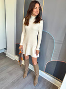 The Nikita Dress features a ruffled neck and flouncy ruffle hem for a playful touch. Made from ribbed material with long sleeves, it keeps you comfortable and stylish. Available in crème and olive green, this versatile dress pairs perfectly with sneakers for a laid-back vibe, boots or heels to elevate your look, or ballet flats for an adorable finish.