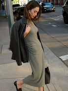 The Rebecca Mock Neck Dress, crafted from soft sweater-like Hacci Rib fabric, offers a flattering midi fit that hugs your curves. Its versatile design easily transitions from a polished look with heels to a laid-back vibe paired with a denim jacket. Available in a stylish Castor Grey, it’s perfect for both casual outings and dressier occasions.