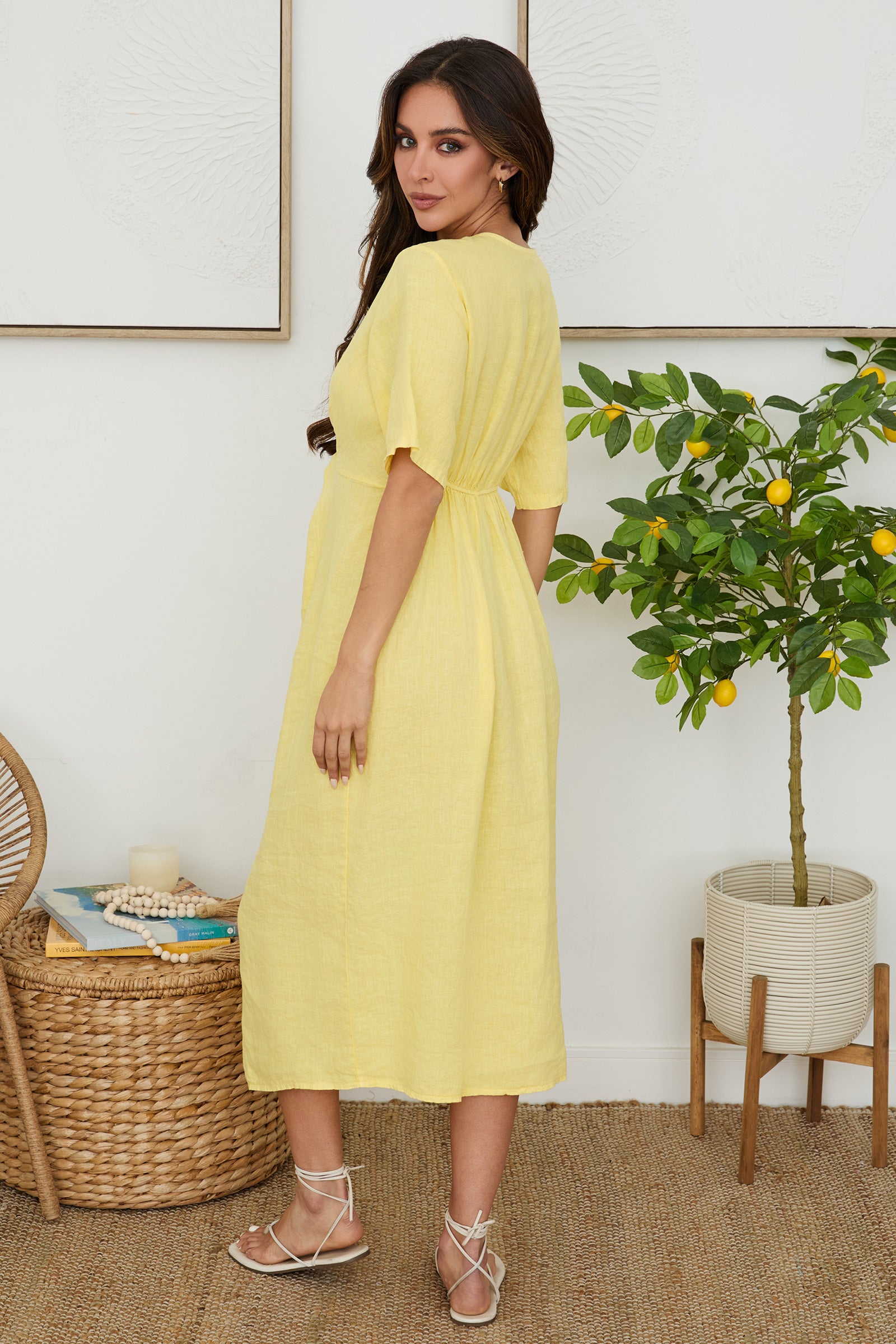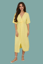 Effortless style meets comfort in this breezy linen dress. The front twist detail adds a flattering, dimensional look while the front slit keeps things cool and contemporary. Crafted from breathable linen, it's perfect for warm weather days when you want to look put-together without trying too hard. The cheerful yellow hue pairs beautifully with sandals, sneakers, or dressy accessories—dress it up or down depending on your mood.
