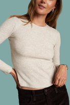 a classic long sleeve silhouette cut; the jolie features a crew neckline and full length sleeves in a soft loose knit sweater rib.