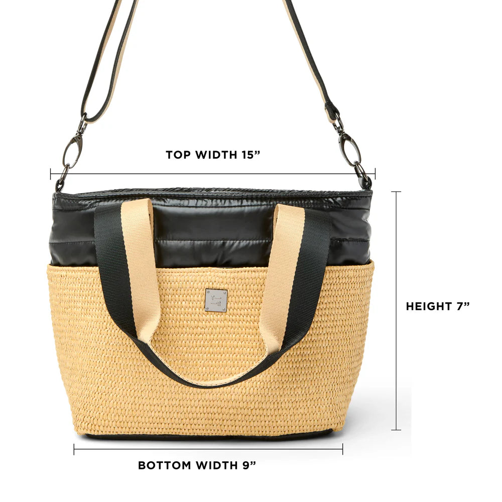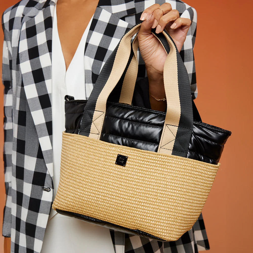 Our signature quilting collides with retro raffia vibes creating this season's IT bag!