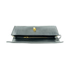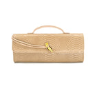 Faux leather croc embossed clutch with top handle and chic gold closure. Adjustable crossbody strap included.