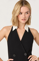 The Perah Dress brings tuxedo-inspired style to your everyday wardrobe. This sleek black mini features a crisp white collared halter neck and sharp front buttons that give it sophisticated edge. Practical pockets keep things functional while the tailored silhouette and streamlined cut deliver modern polish. Dress it up for a night out or keep it casual—this versatile piece works either way.
