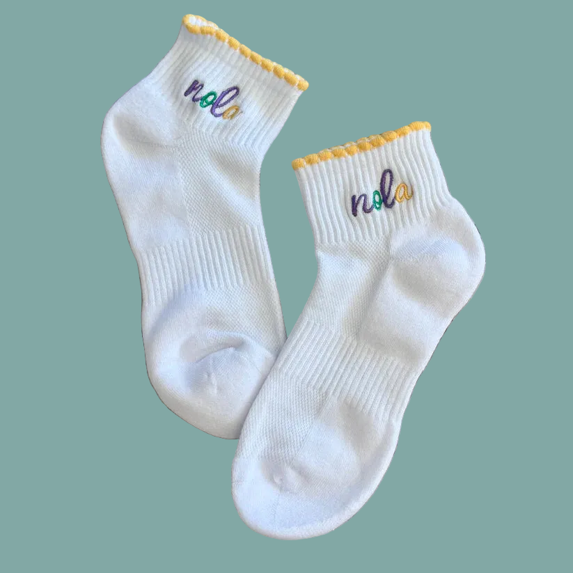 Celebrate the spirit of New Orleans with these vibrant Mardi Gras NOLA ankle socks. Featuring bold colors and festive designs inspired by the iconic celebration, they're perfect for showing your love of NOLA year-round. Comfortable and fun, these socks add a playful pop to any outfit. Whether you're a parade enthusiast or just love the energy of Mardi Gras, slip into a pair and let your feet do the celebrating.