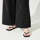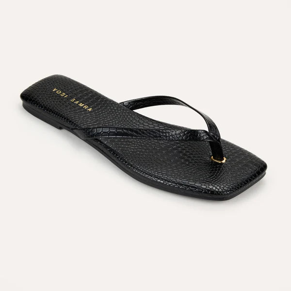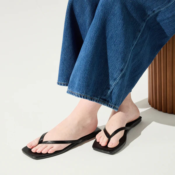 The perfect everyday sandal with a modern edge. The Mercer features a rich black croc-embossed finish in soft vegan leather, paired with sleek pyramid stud detailing for a refined monochrome look. A square open toe and elevated metal accent at the toe thong add a polished touch, while the lightly padded footbed keeps you comfortable all day. Finished with a durable rubber sole and our signature snake print design for added grip and style.