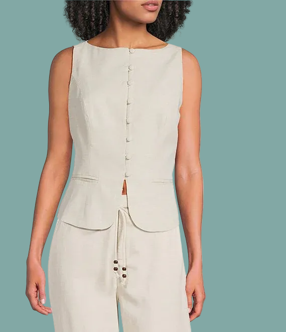 Effortless layering meets timeless style with the Taylor Vest. Crafted from a breathable linen blend, this round neck vest features covered buttons down the front for a polished, refined look.