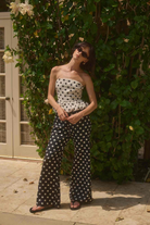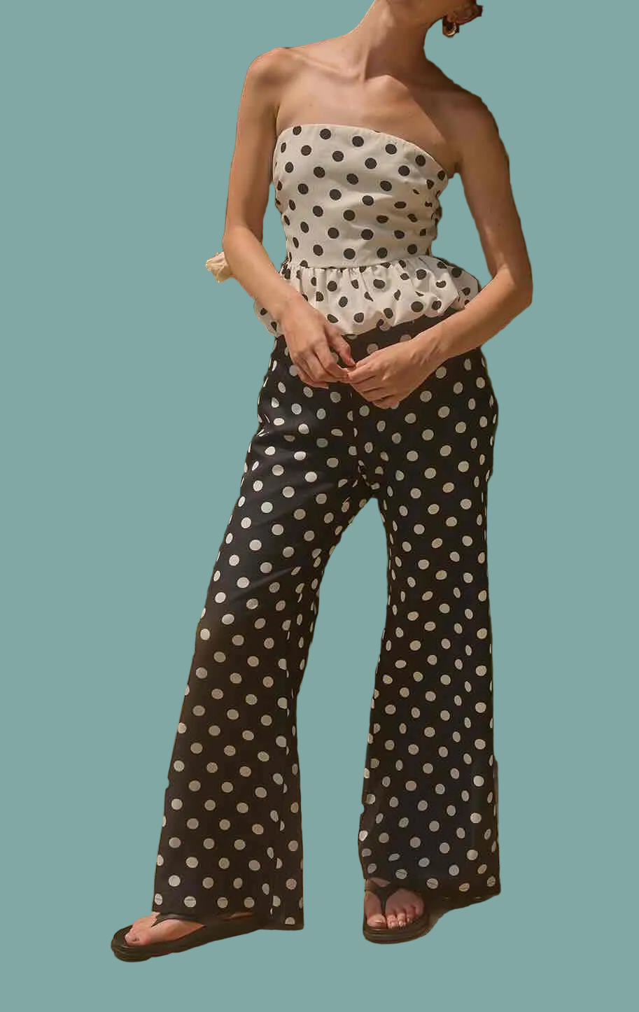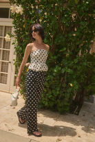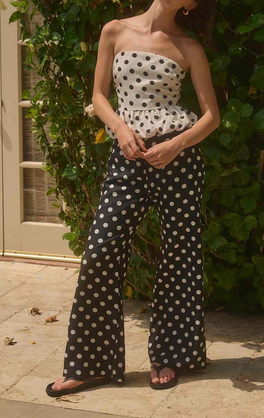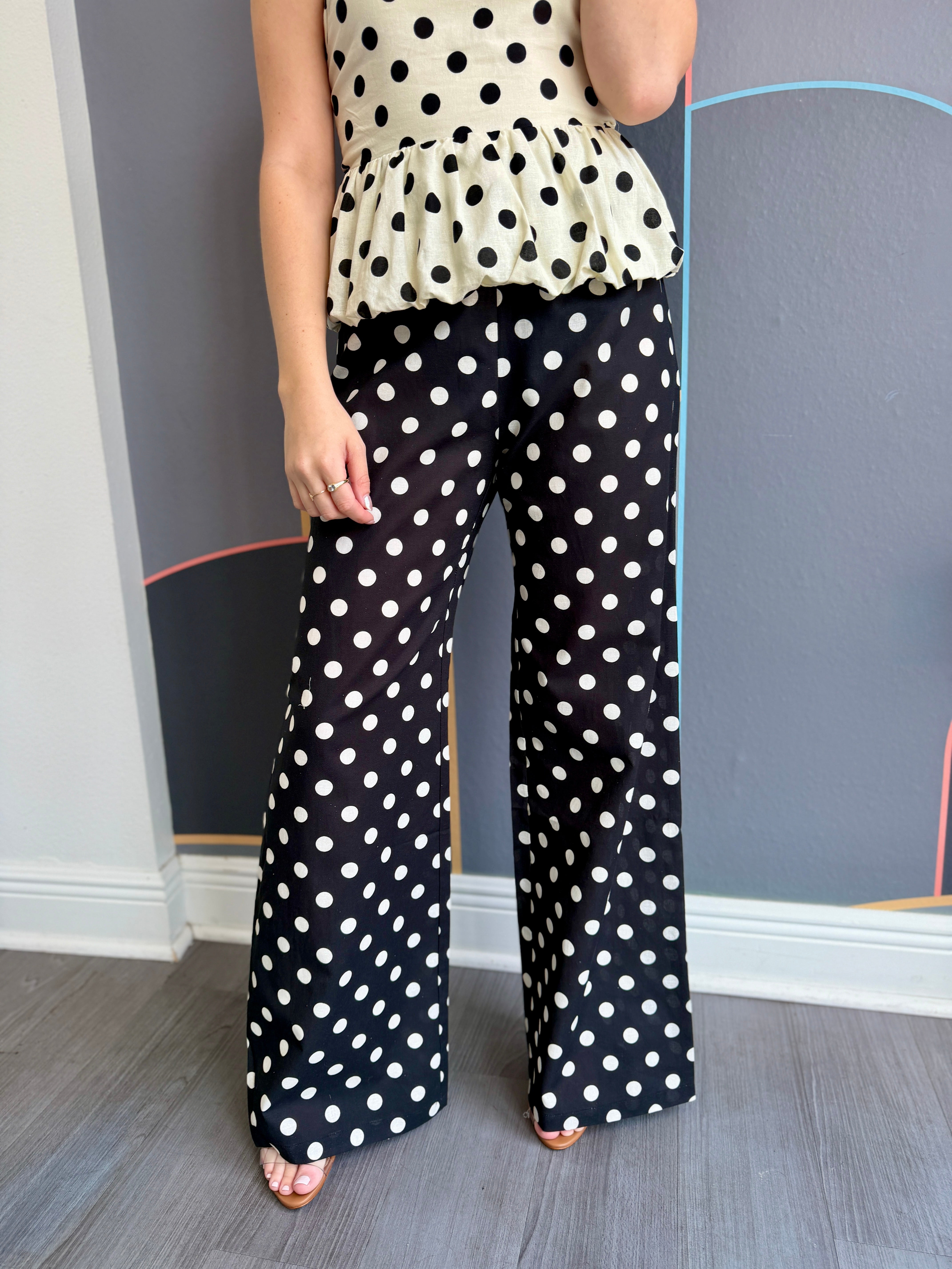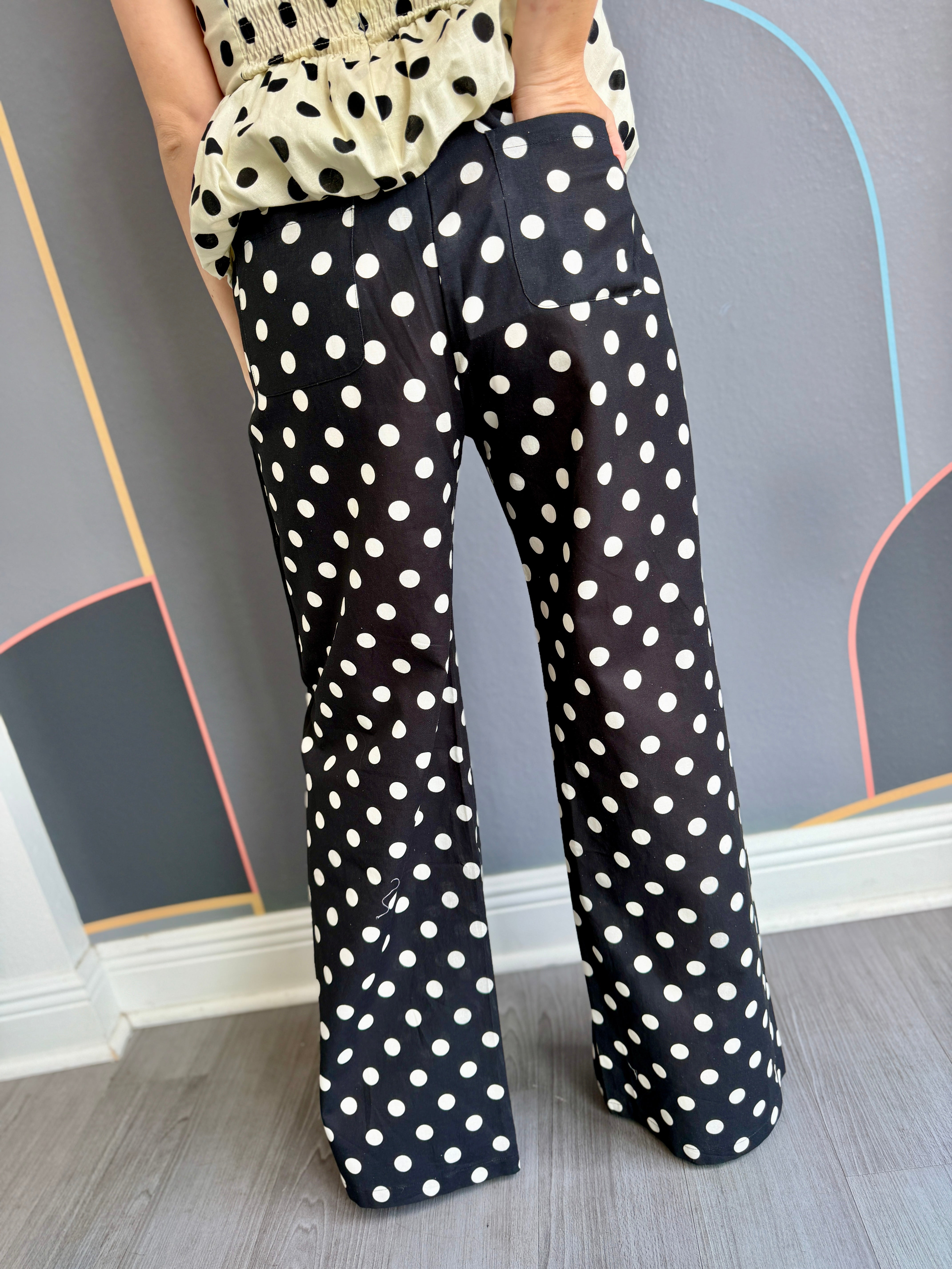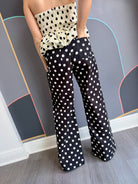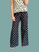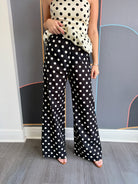 Meet your new statement staple — the Lucy Paris Lylah Pant. Designed in a timeless black and cream polka dot print, these effortlessly chic pants bring a playful yet elevated feel to any outfit. Featuring a flattering high-rise fit and a relaxed, wide-leg silhouette, they elongate the legs while offering all-day comfort. Lightweight and breezy, the Lylah Pant moves beautifully with you, making it perfect for everything from sunny brunch dates to vacation evenings. Style it with the matching top for a bold, coordinated look or pair it with a simple blouse or tank for an easy, polished outfit. Classic, feminine, and endlessly versatile — this is the kind of piece you'll reach for again and again.