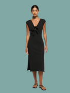 A relaxed take on your signature little black dress, the Kalee is unapologetically classic. Made in easy cotton jersey, this form-fitting midi dress features front bow-tie detailing, a flattering v-neckline, and side slit openings for total ease. This one comes in Jet Black.