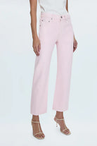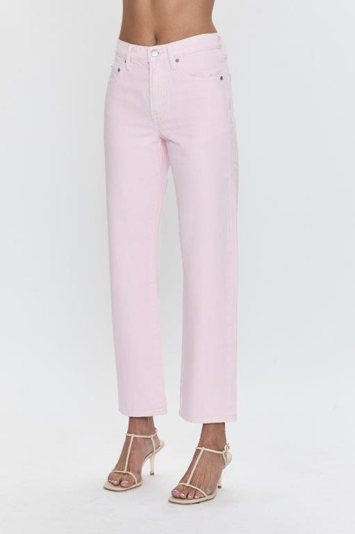 Meet your new favorite jeans. Designed with a flattering mid-rise and a unique bowed leg silhouette, these jeans offer a modern twist on a classic style. The straight leg is subtly bowed at the knees, creating a gently arched shape that's both comfortable and chic. In their soft Blush pink denim, these jeans add a touch of feminine color to your wardrobe. The cropped ankle length and clean hem make them perfect for showcasing your favorite shoes.