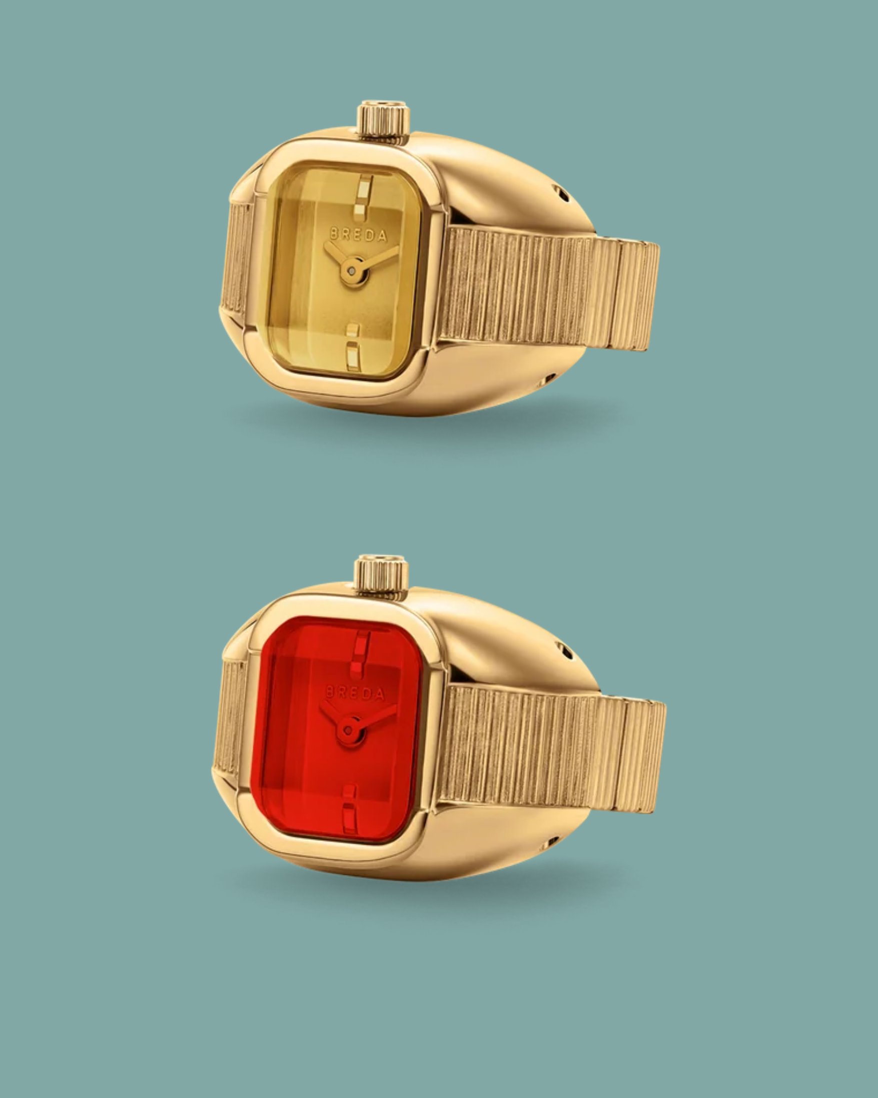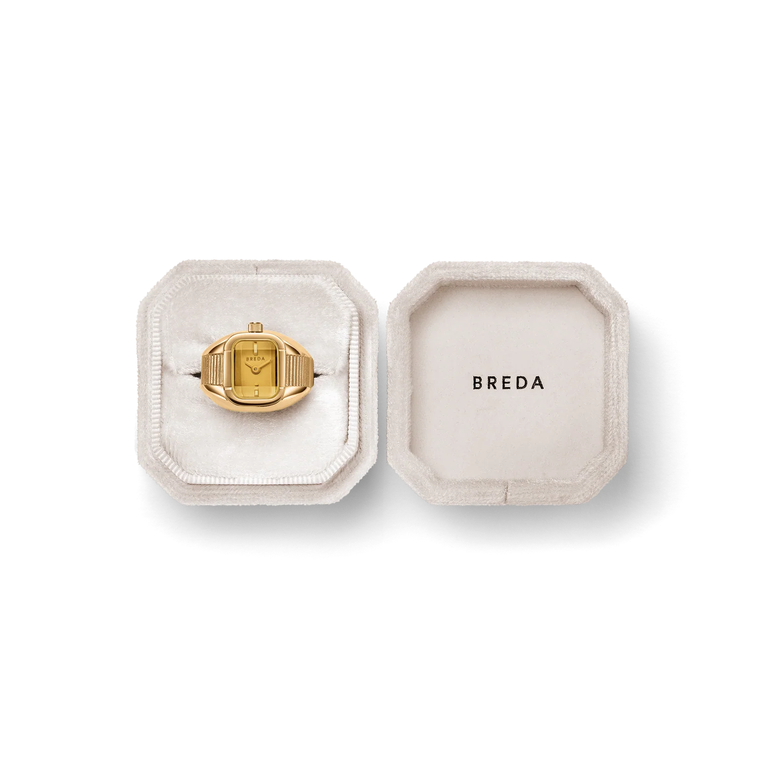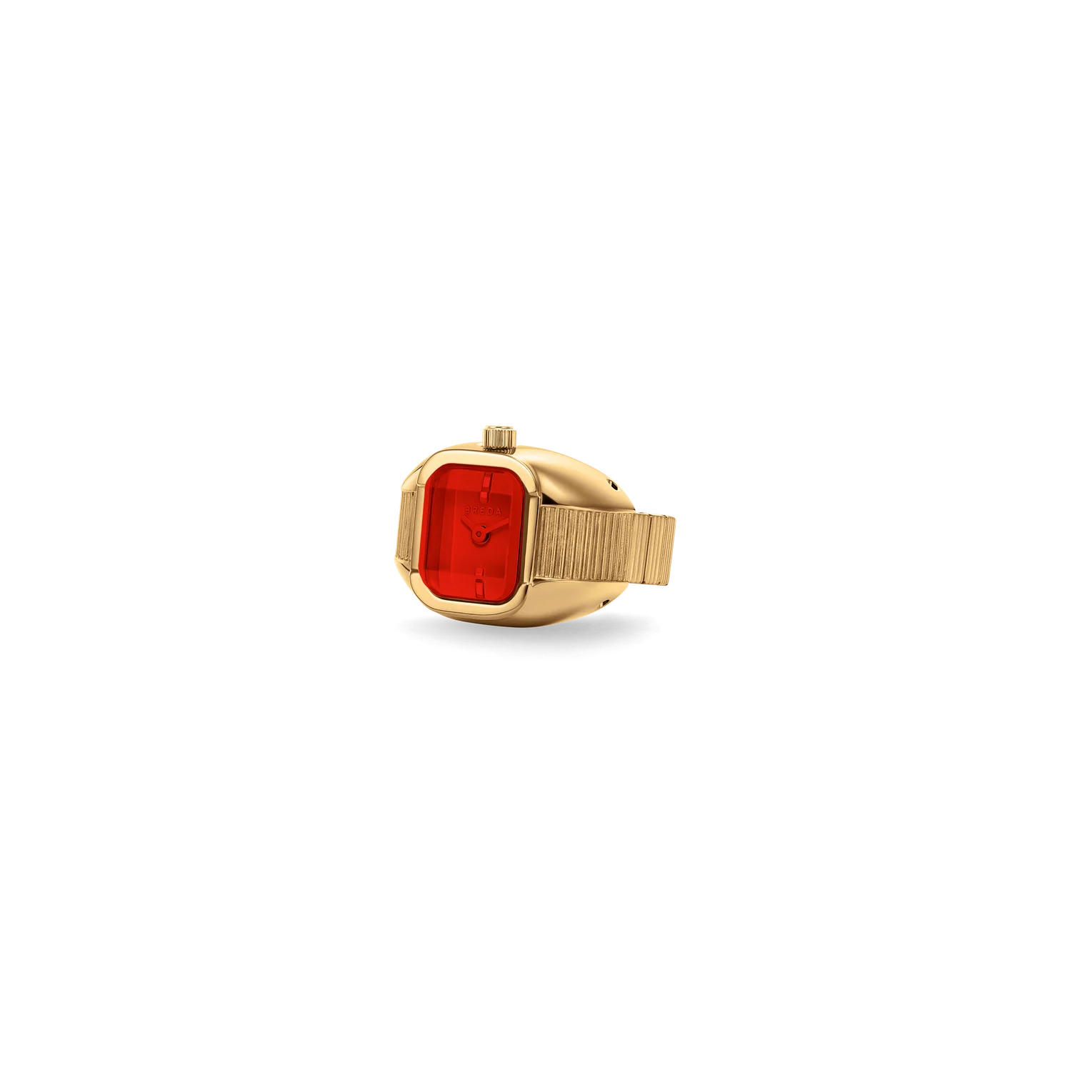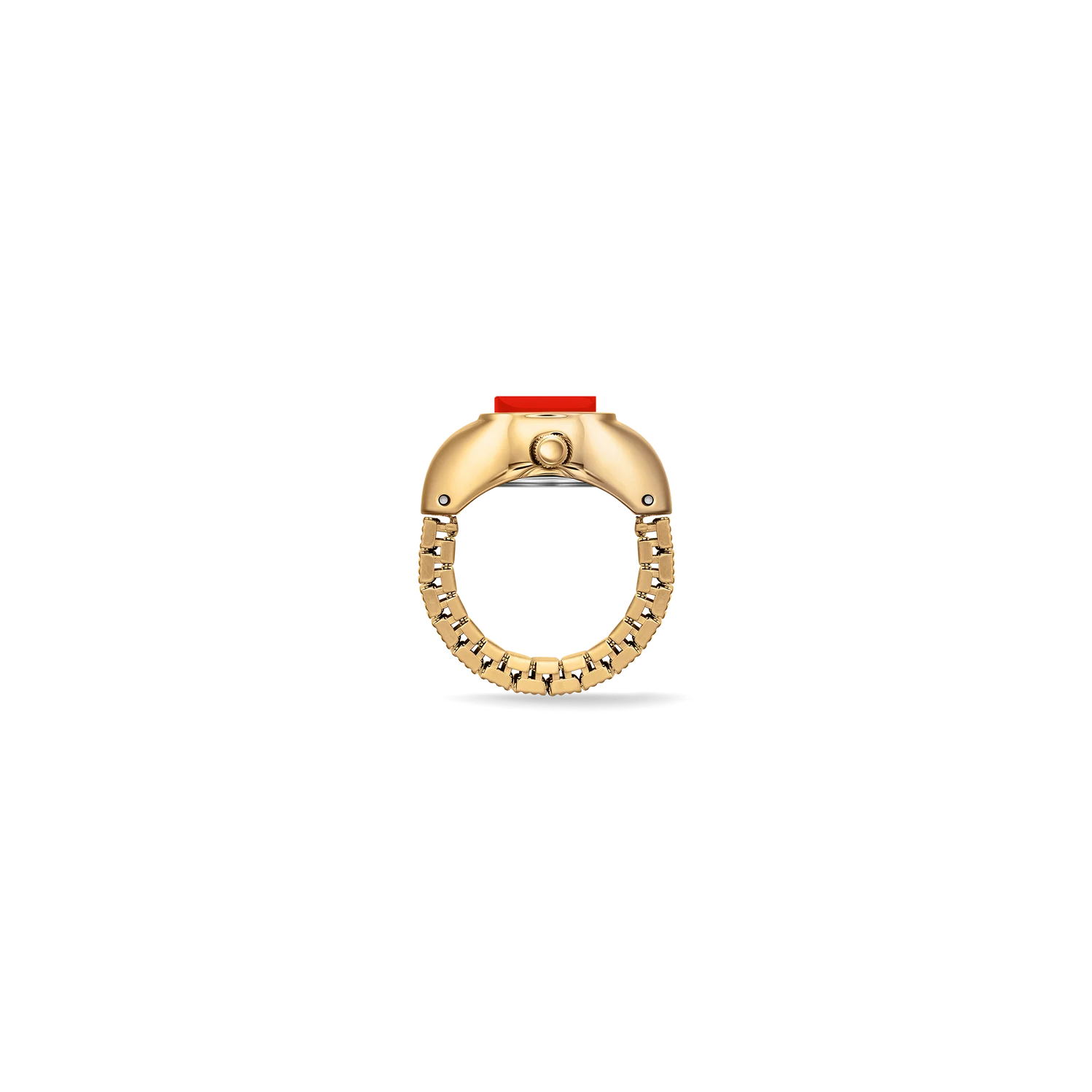 Inspired by the magic of nighttime, the Nocturne Time Ring captures nocturnal elegance on your wrist. This striking timepiece features an 18K deep gold-plated stainless steel case with soft edges and a distinctive 16mm rectangular design. The flame-colored crystal creates a mesmerizing contrast against the polished gold ridges that frame the dial, while the expandable band ensures a comfortable fit for any occasion. Perfect for those who appreciate bold, sophisticated style with a touch of mystery.
