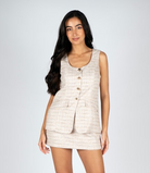 The Angeline Romper in Beige Tweed blends vintage charm with a modern twist. Made from a premium tweed blend, its textured fabric and warm beige tone offer a polished, casual look. The sleeveless design features a flattering scoop neck, gold-tone buttons, and front flap details, while the tailored fit and mini length keep it chic and comfortable. Ideal for business casual outings, luncheons, or daytime events, this romper lets you dress up with ease and confidence.
