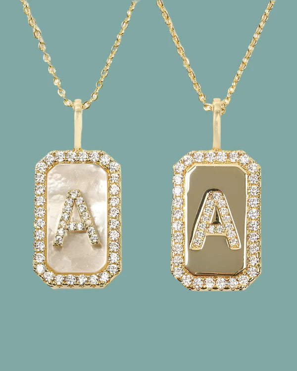 Wear it your way. The Love Letters Double-Sided Necklace combines some of our favorite features: dog tag + mother of pearl + pavé diamond initials = We're OBSESSED. And it's double sided?!?! That is Next Level.