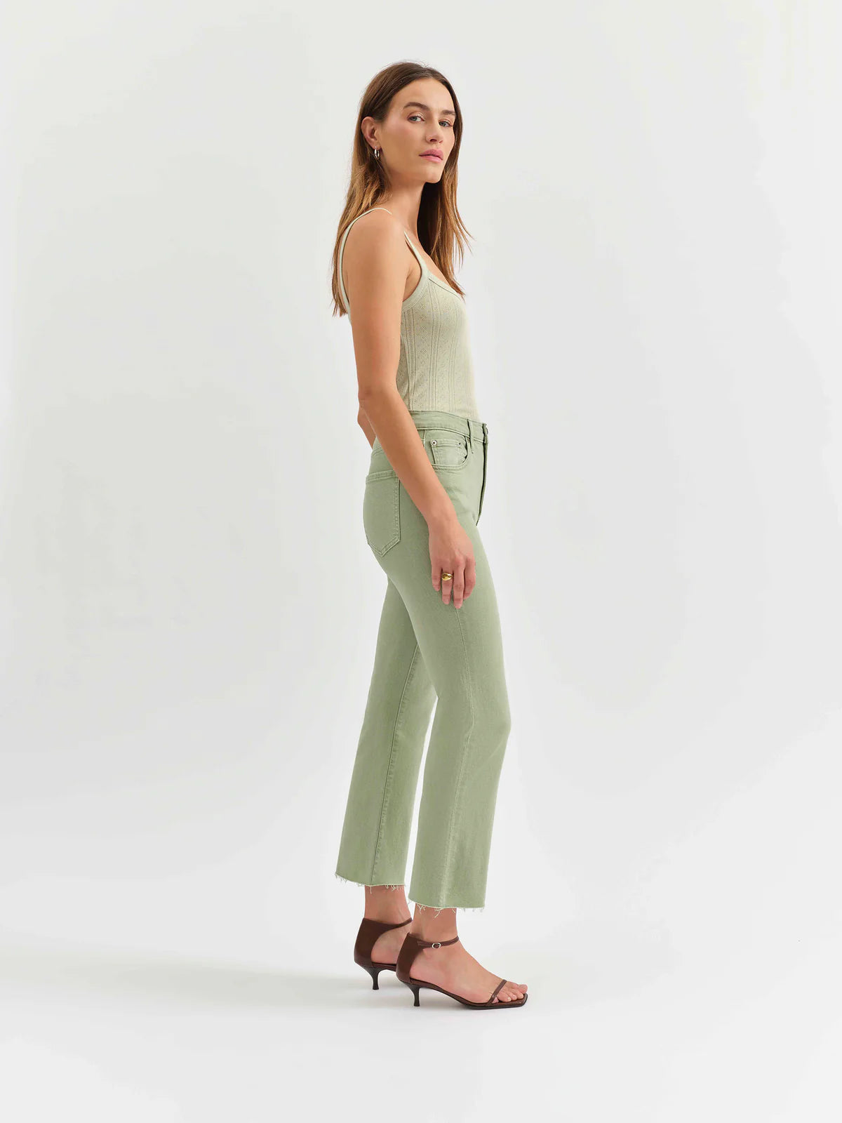 Show off your playful side with the Shy Girl Raw Cut in Pistachio. These high rise cropped kick flare jeans feature an optimistic green hue and are made from our Just Right fabric - a flattering blend of rigid and stretch. With an 11" rise and 26.5" inseam, these jeans will make you feel confident and comfortable all day long.
