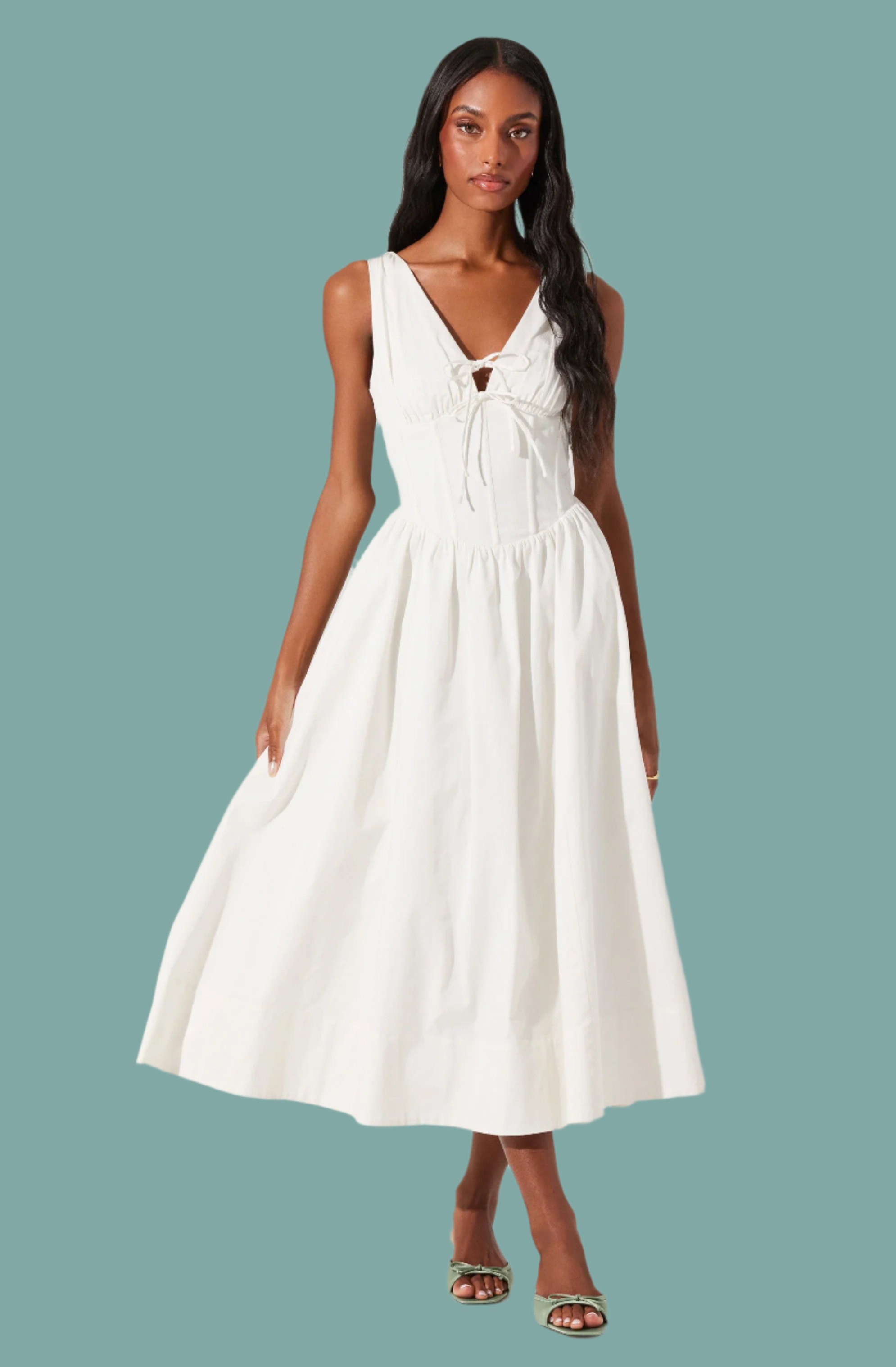 Be the center of attention in the Maili Dress. This corset poplin midi dress features a V-neck with lace-up detail for a playful touch. The boning throughout the bodice creates a flattering silhouette, while the smocked back and concealed zipper provide a perfect fit. With functional side pockets and a gathered skirt, this dress is both stylish and practical.