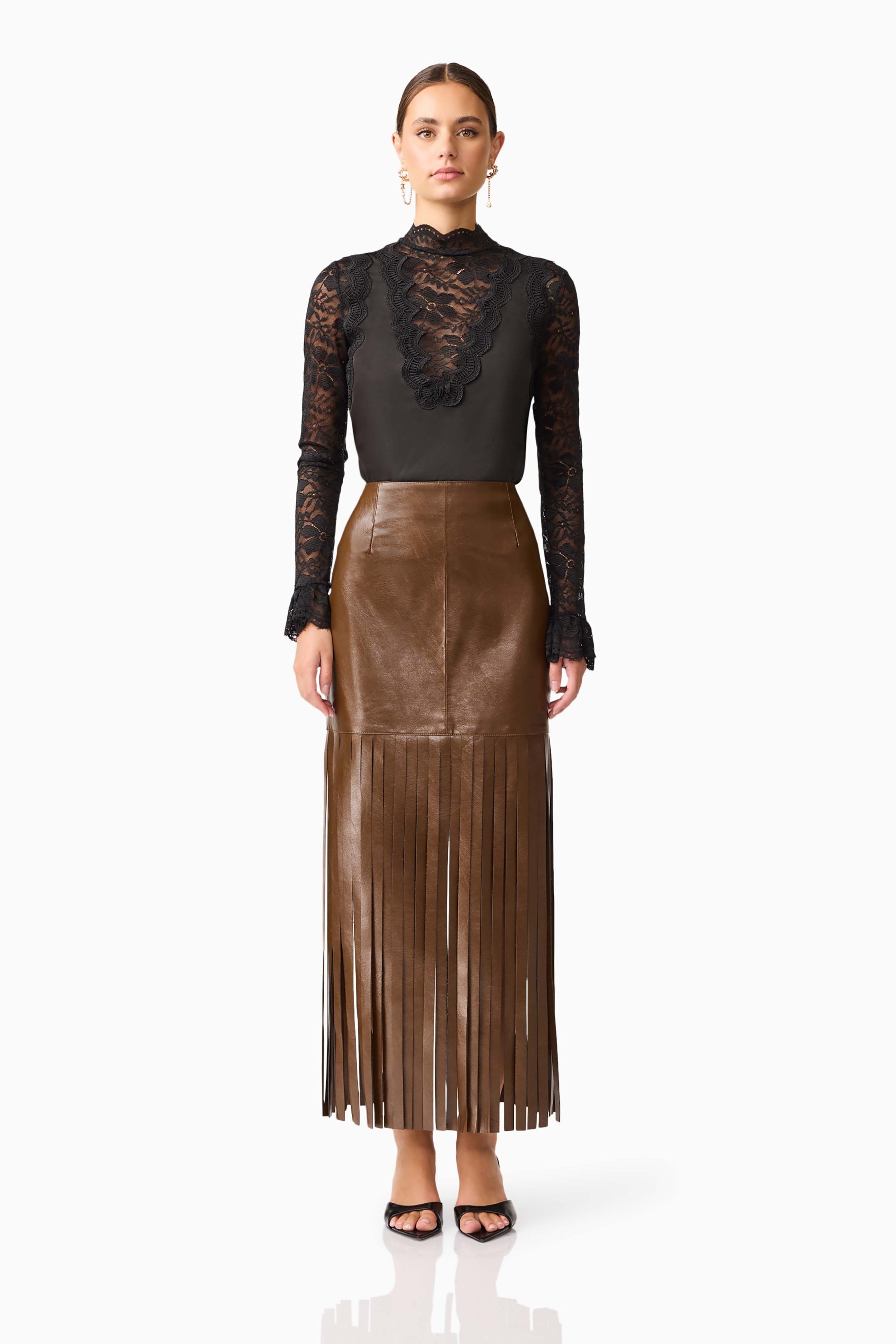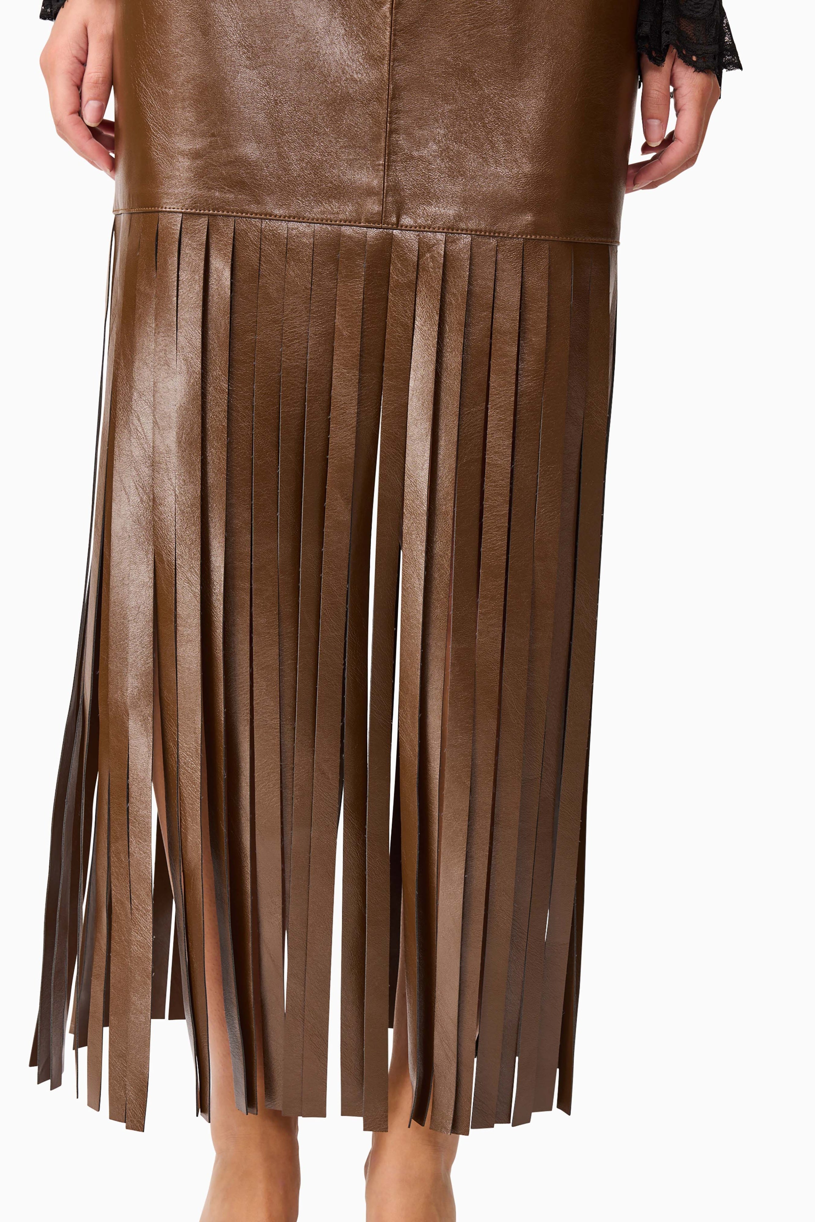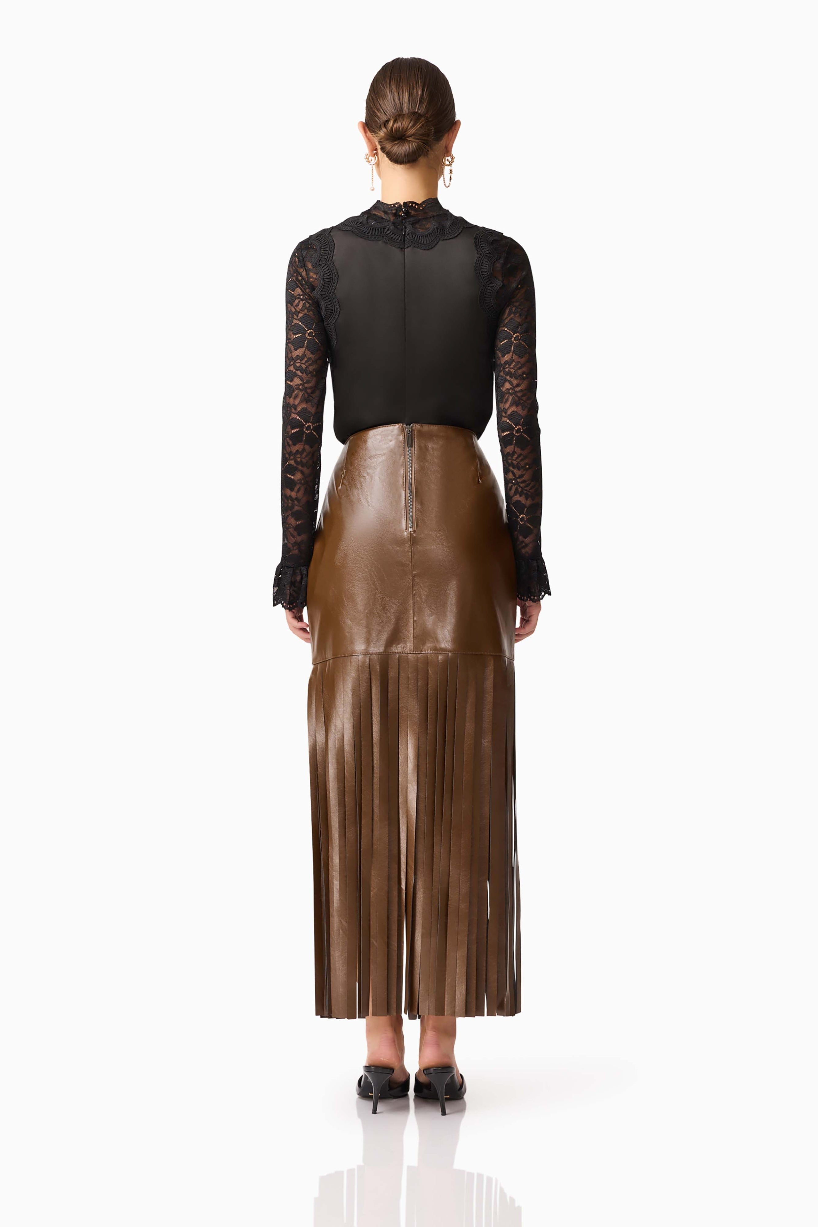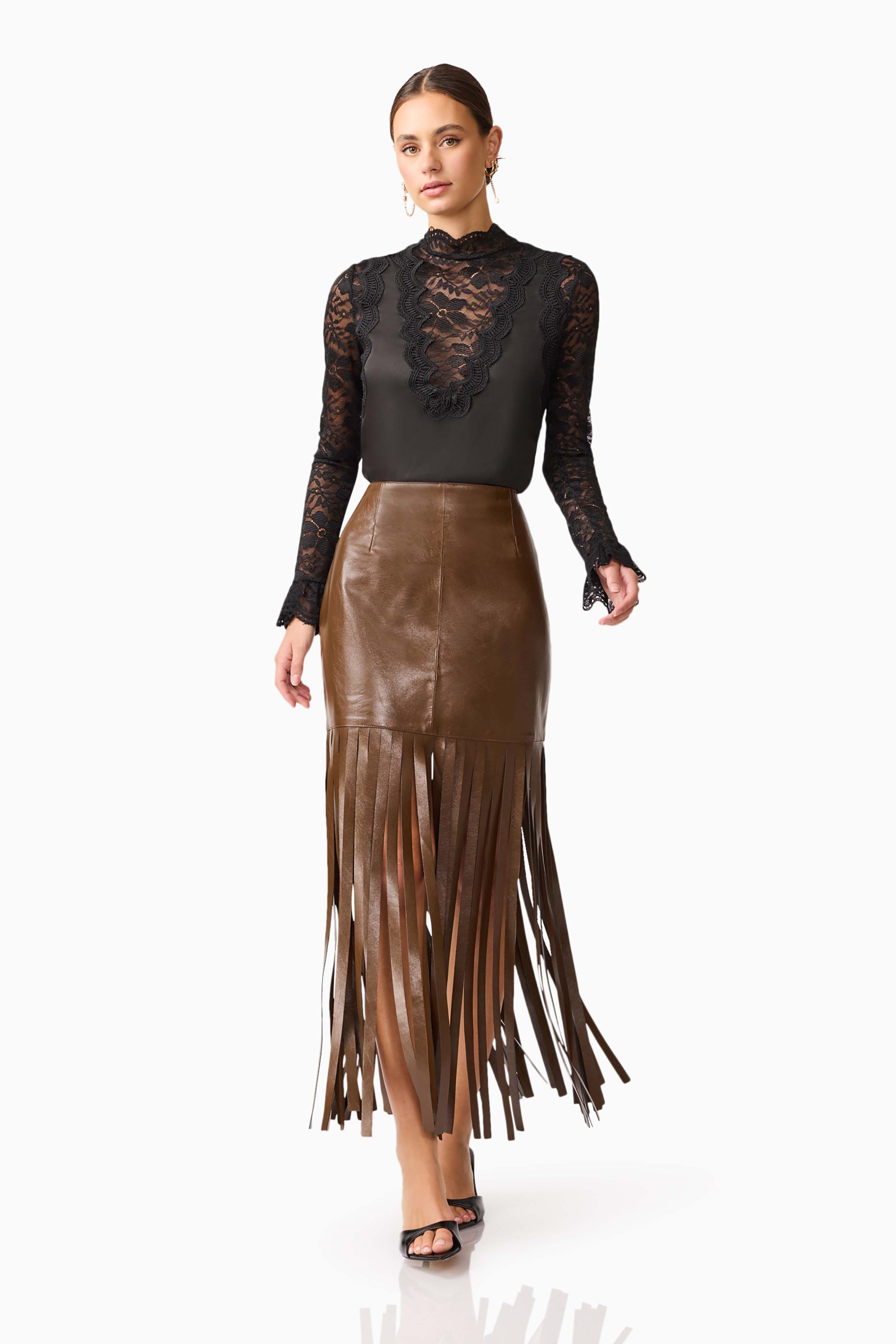 Slip into this chic chocolate vegan leather skirt featuring a flattering high waist, playful tassel detailing along the hem, and a convenient zipper closure for easy wear.