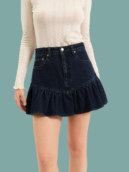 The Smooch Skirt in Moonlight Rinse is a denim ruffle skirt in a romantic dark wash. Clean lines flare out into feminine ruffles to create an elevated silhouette.