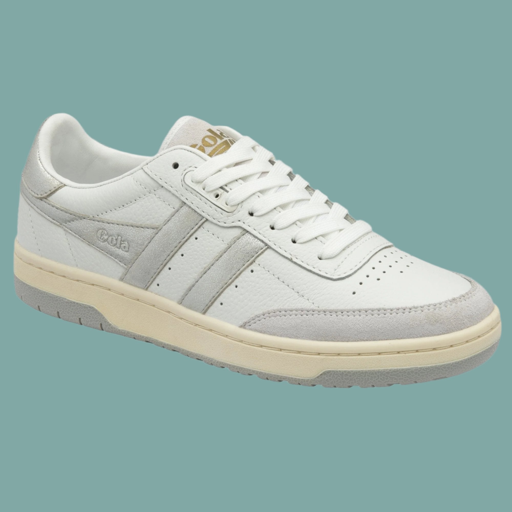 Taking a metallic twist, Falcon Mirror in white/silver is a versatile women’s sneaker that looks equally comfortable with off duty looks or tailored trousers. Sat on a white leather upper, the silver metallic Gola wingflash highlights to the sides of this classic Gola women’s sneaker ooze contemporary chic with relaxed tennis credibility and a warm nostalgia. Finished with a coordinating grey highlight outsole, Gola’s Falcon Mirror offers perennial chic sneaker looks effortlessly.