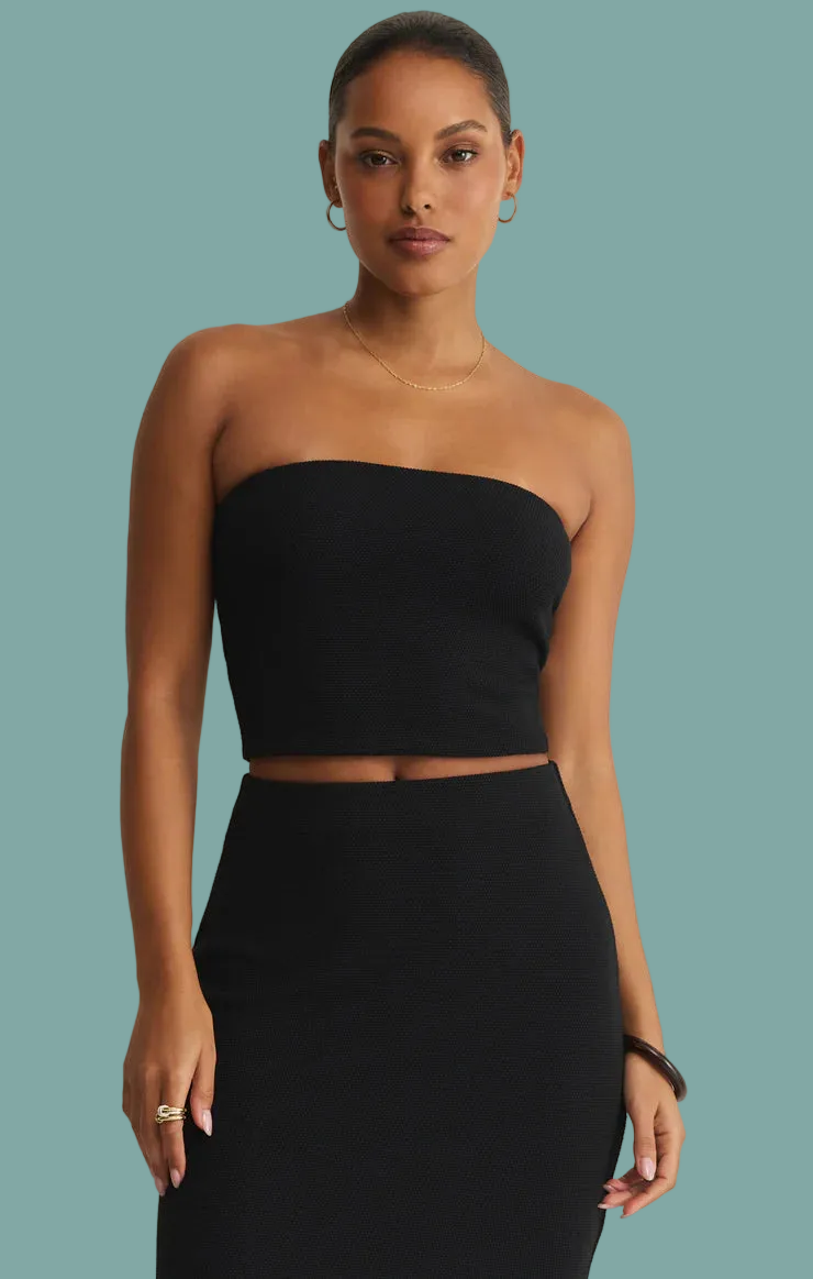 A sleek textured tube top with removable straps that brings a modern edge to summer styling.