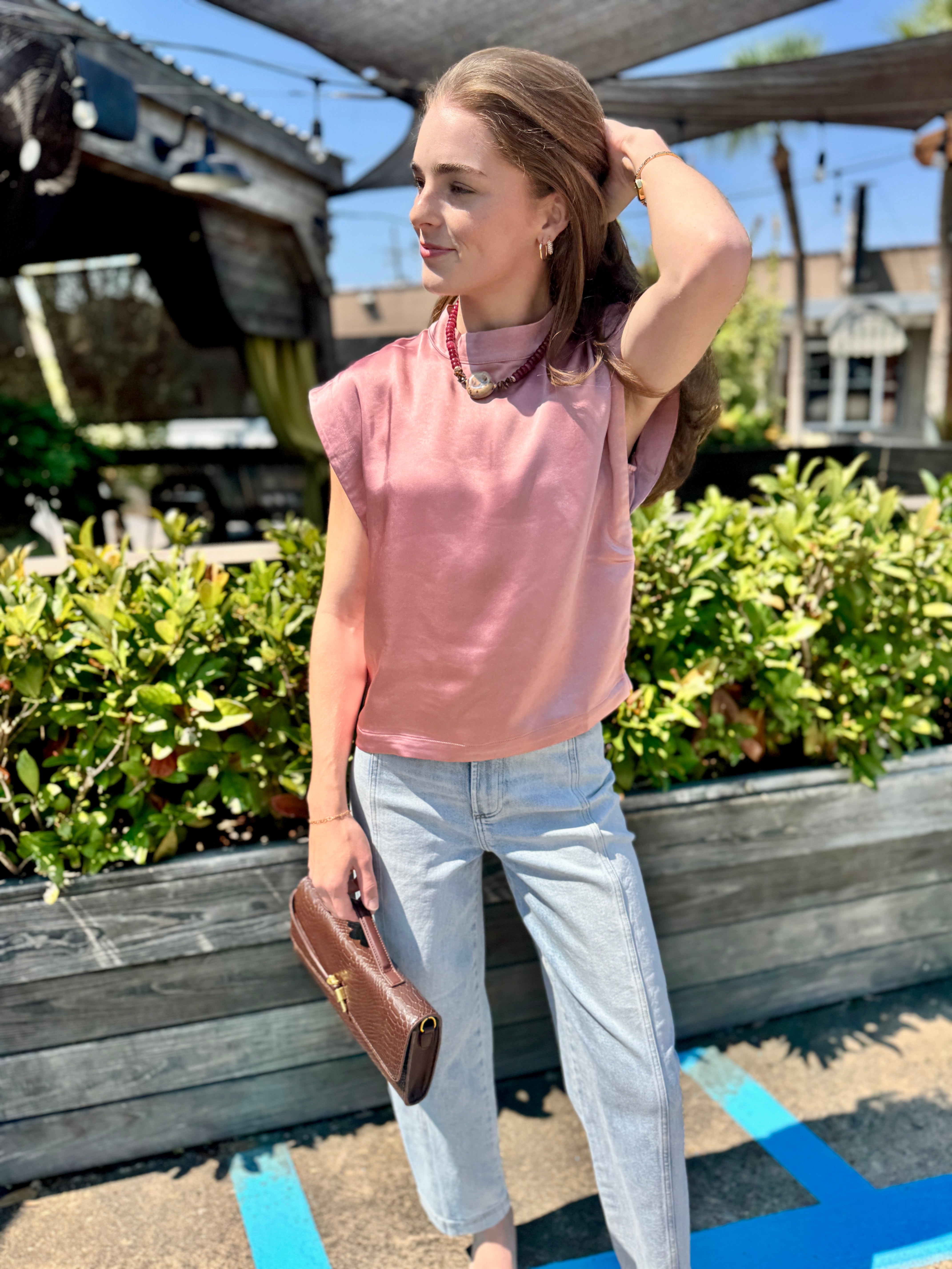The Julian Top features a sleek boxy silhouette with a sleeveless design and a mock neck, crafted from smooth 100% polyester satin. Its relaxed fit and lustrous fabric offer comfortable wear with a polished, casual look perfect for both day and evening occasions.
