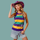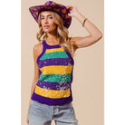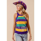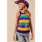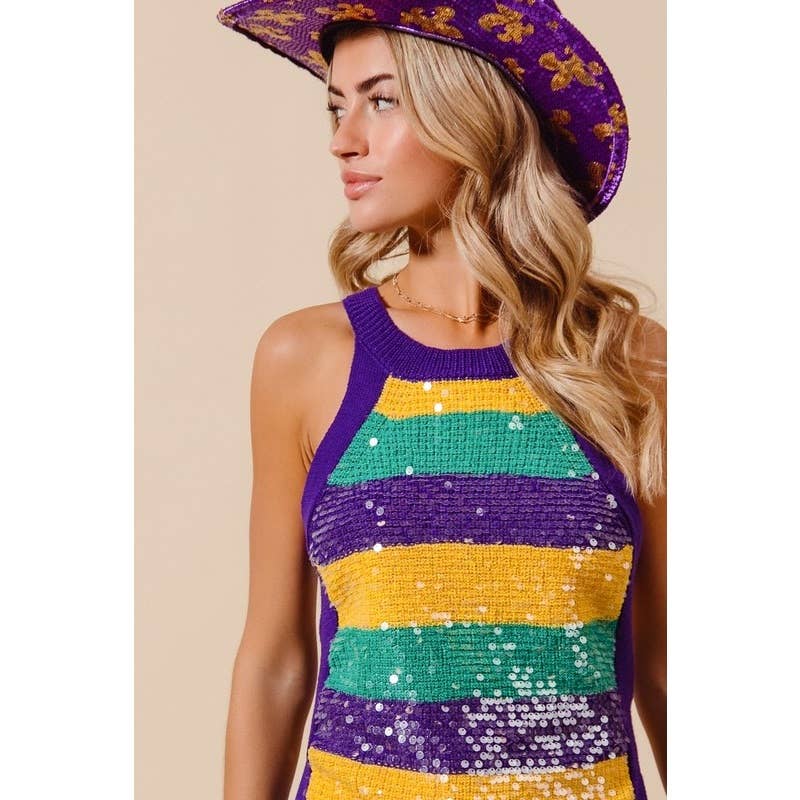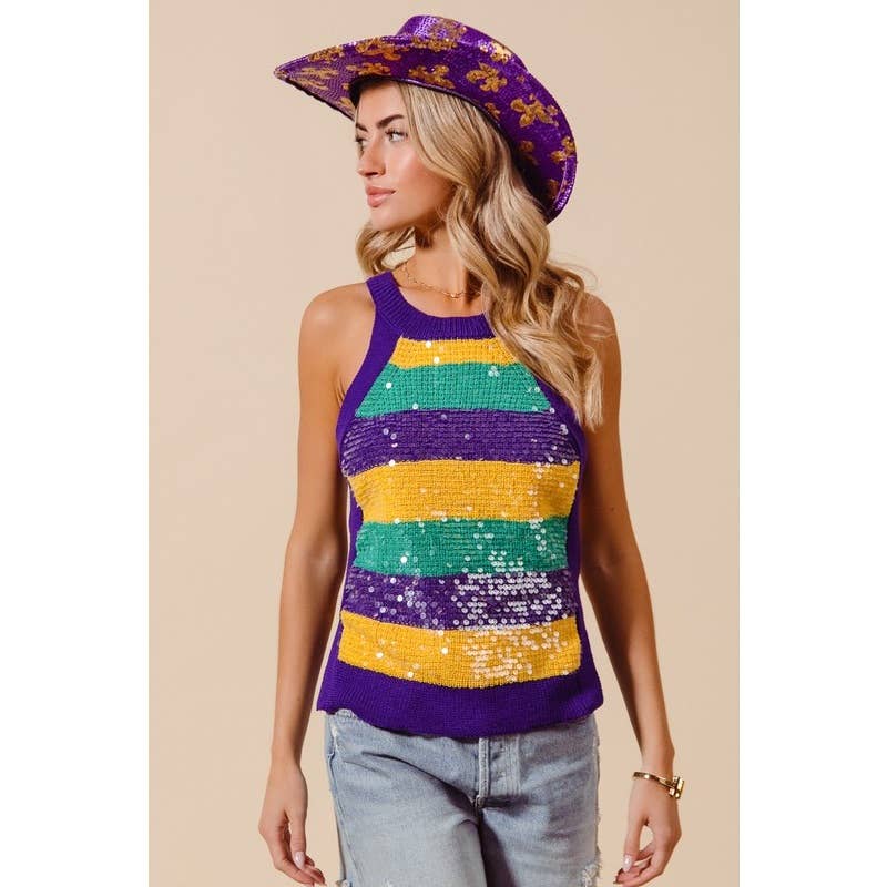 The Mardi Gras Wide Stripe Sequin Tank is a vibrant, festive piece perfect for celebrating Mardi Gras. It features bold, wide stripes in bright, cheerful colors that reflect the spirit of the season. The addition of clear sequins scattered throughout the stripes adds a touch of sparkle and glamour, making this sweater eye-catching and fun. The sweater's relaxed fit and cozy material make it comfortable for all-day wear, while the sequins give it a party-ready vibe.