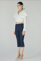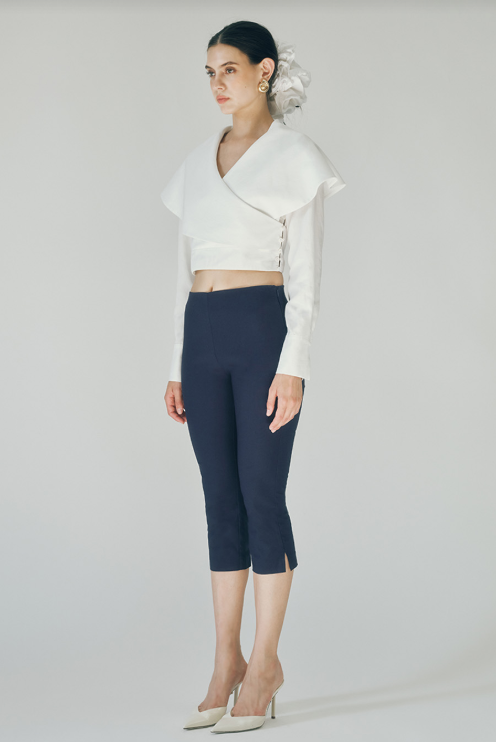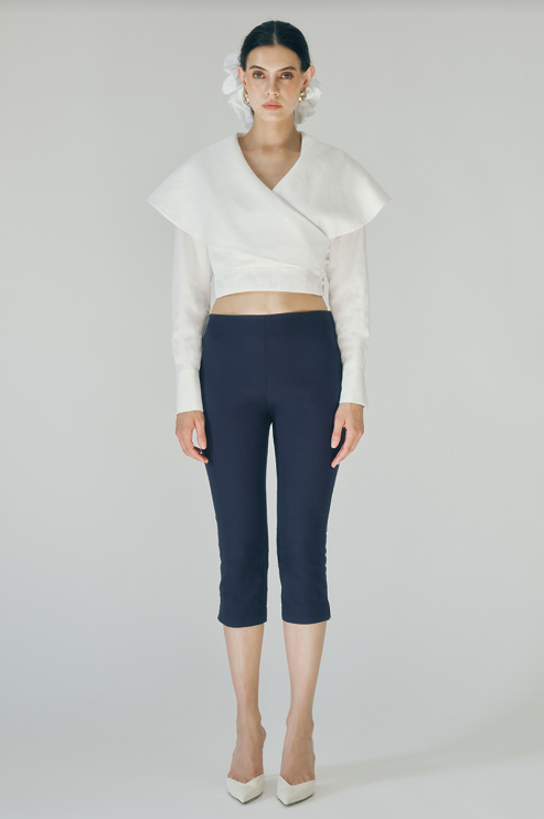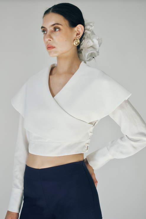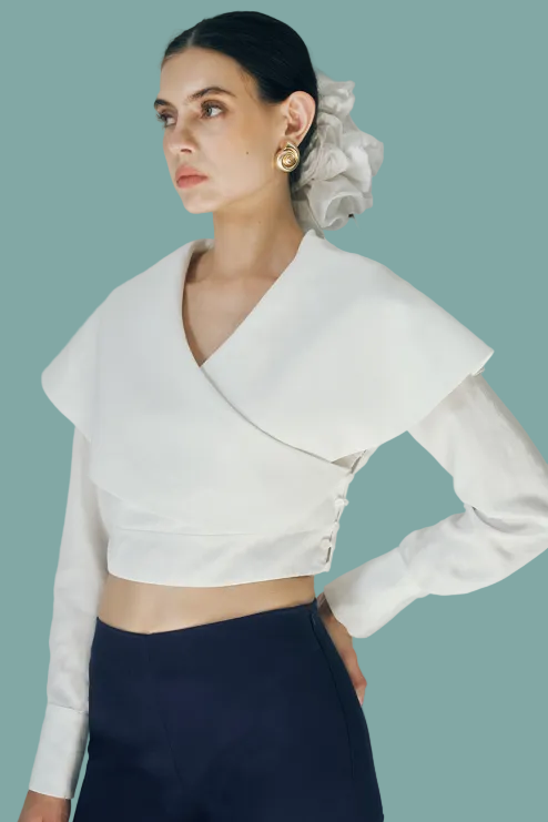 The Rizo Top is a sophisticated white long sleeve cropped blouse designed with elegant surplice detailing at the front and flowing cape-like layers in the back. The surplice neckline creates a flattering, wrapped silhouette, while the caping adds movement and dimension to your look. Perfect for layering or wearing solo, this piece transitions seamlessly from office to evening wear. The cropped length pairs beautifully with high-waisted bottoms for a polished, modern aesthetic.