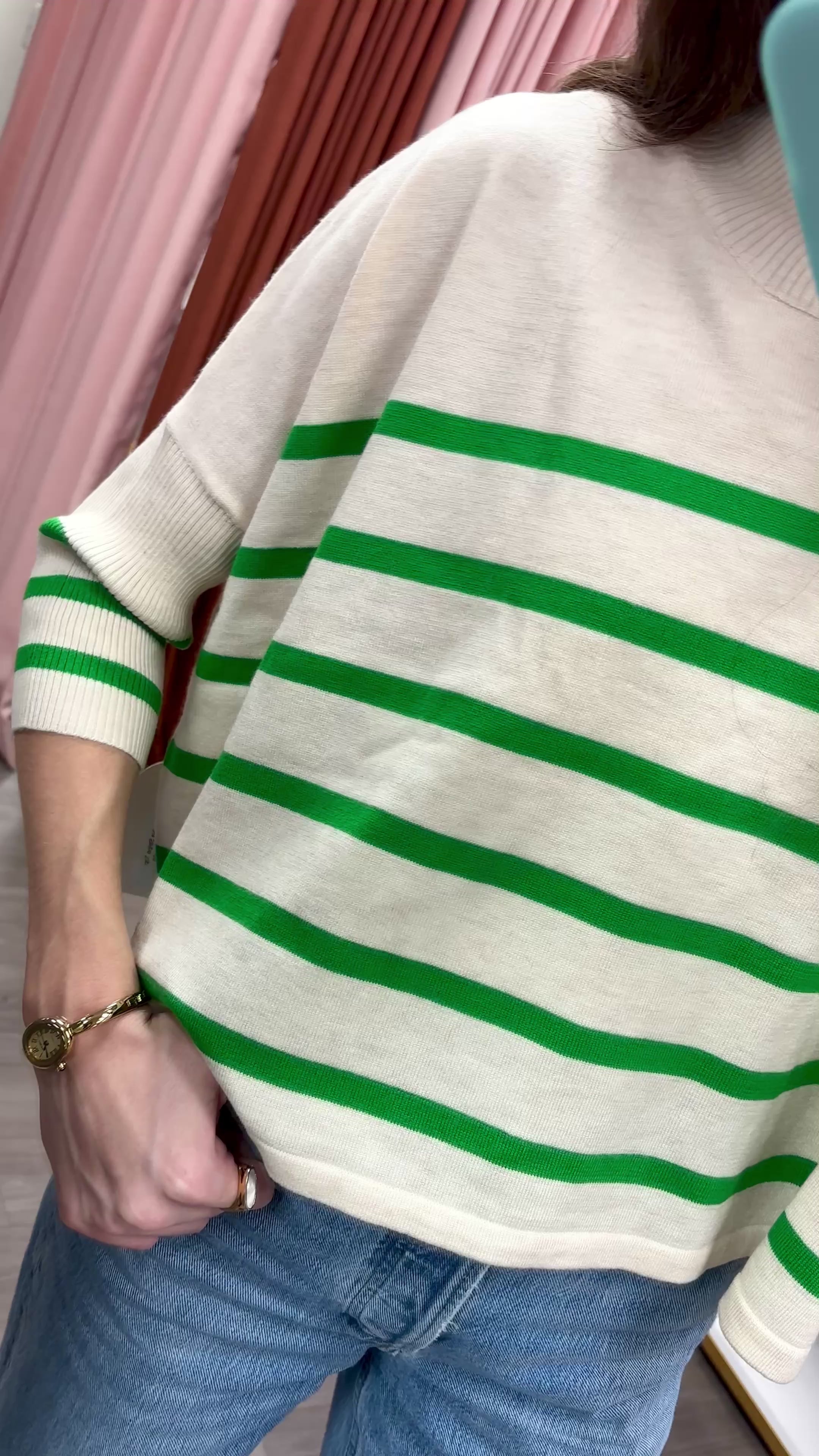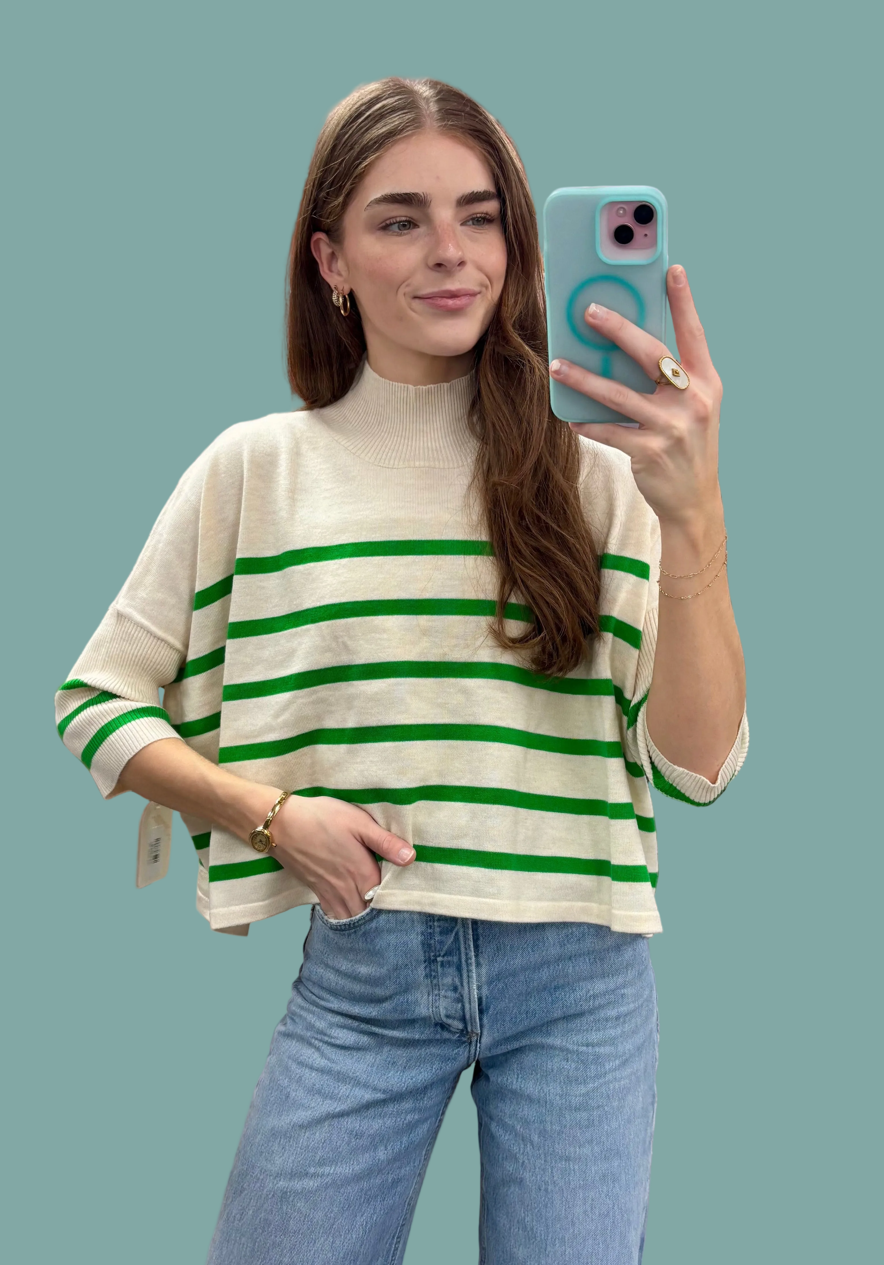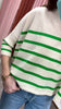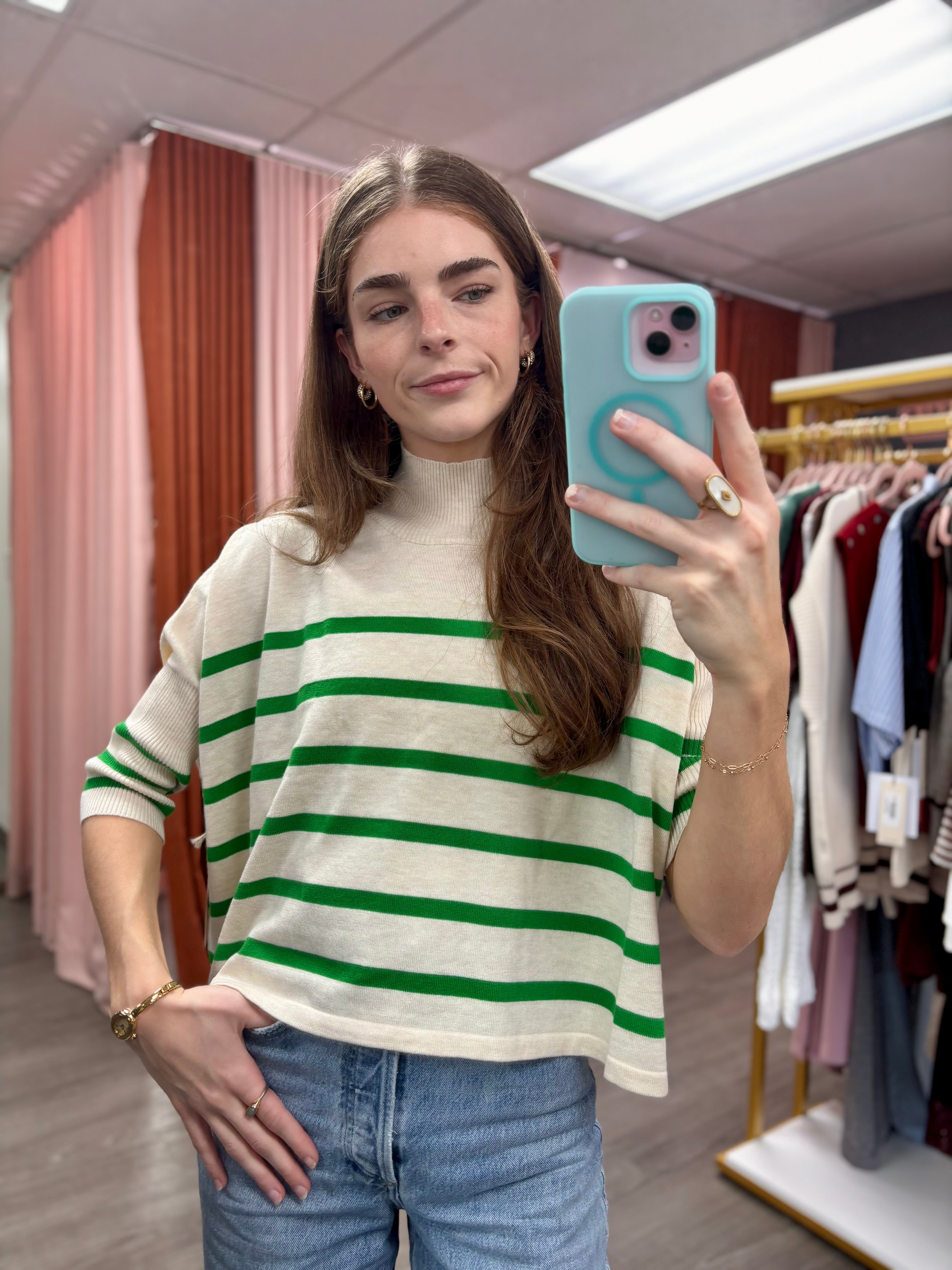 The Aja Stripe Top brings effortless style to your everyday rotation. This knitted sweater features a timeless ivory and green striped pattern that pairs easily with your favorite bottoms. The thoughtful blend of materials—including wool, nylon, acrylic, polyester, and spandex—creates a comfortable, durable piece that moves with you. Perfect for layering or wearing solo, it's a versatile staple that works across seasons.