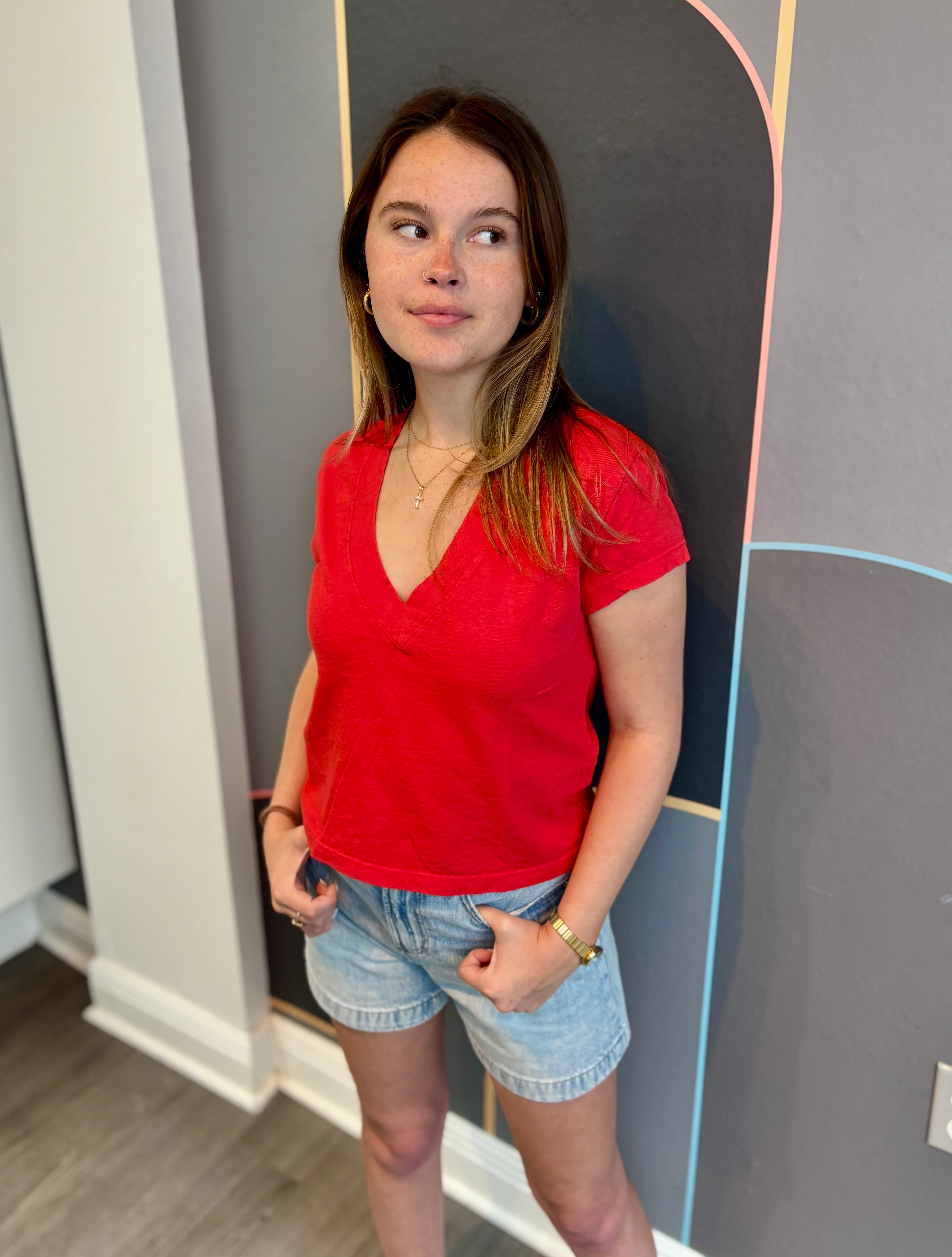 Get ready to turn heads in the Alanis Recycled Cotton V Neck! Made with recycled and organic cotton, this top not only looks good, but also benefits the planet. The fabric has a unique texture and a soft feel, making it the perfect choice for any occasion. Proudly produced in California.